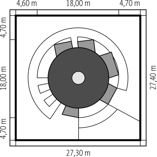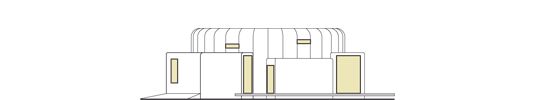 Ściany zewnętrzne: konstrukcja technologia szkieletowa, „boksy” - murowane. Rozwiązania instalacyjne energooszczędne:. Ogrzewanie: pompa ciepła, rozprowadzenie ciepła: ogrzewanie podłogowe. Wentylacja: wentylacja mechaniczna nawiewno-wywiewna z rekuperacją :. Elewacje: walec z matowego tworzywa sztucznego, zewnętrzne ściany sypialni, łazienki i pomieszczenia gospodarczego – panele z tworzywa sztucznego. Stolarka: aluminiowa.