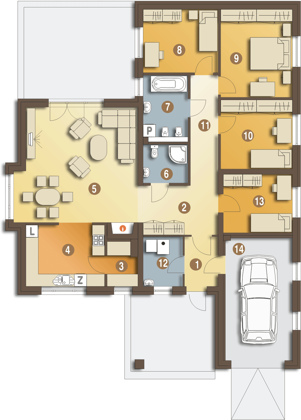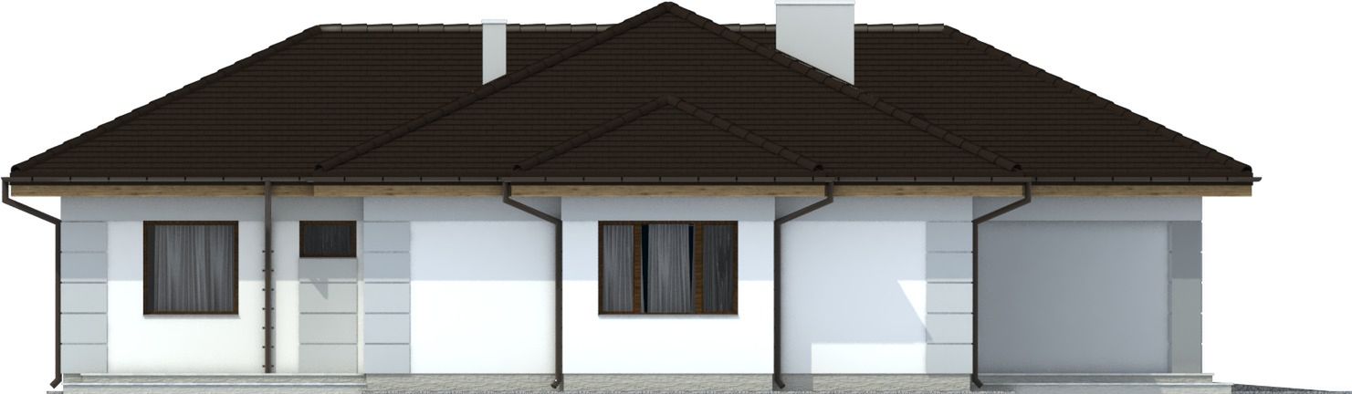 Graficzne opracowanie rzutów poglądowych widocznych na karcie projektu zostało wykonane przez Extradom.pl. Prezentowane przez Extradom.pl wizualizacje wykonane zostały przez autora projektu i należy poczytywać je jedynie za przykład i propozycję wykończenia, wizję architektoniczną autora projektu. Ostateczne wykończenie budynku może nastąpić na wiele sposobów. Szczegółowe rozwiązania zastosowane w oferowanej dokumentacji - w tym również ilość, lokalizacje i wygląd okien, drzwi, kominów - mogą w niewielkim stopniu różnić się od prezentowanej wizualizacji budynku.