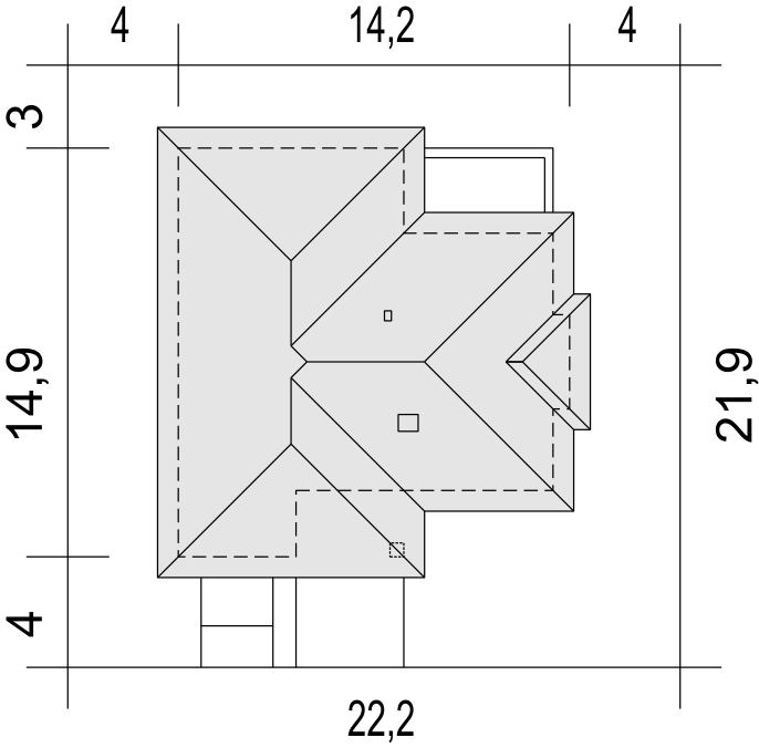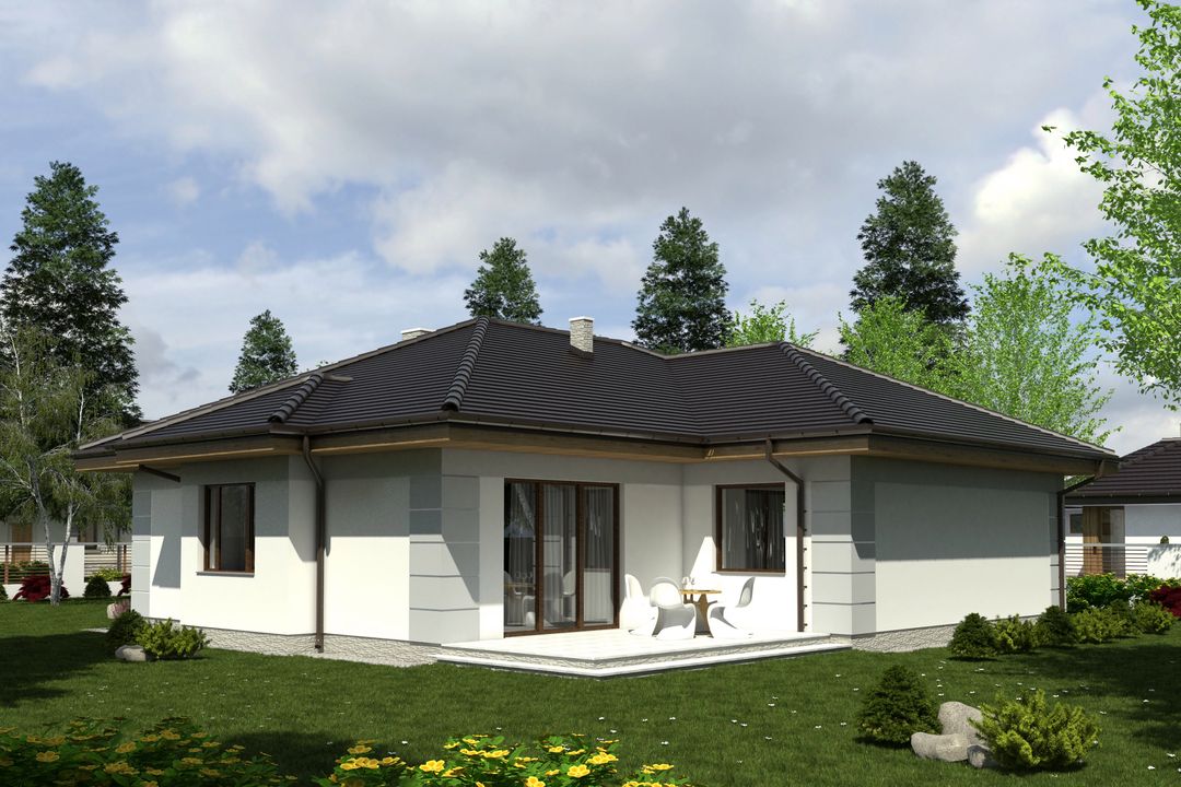 Graficzne opracowanie rzutów poglądowych widocznych na karcie projektu zostało wykonane przez Extradom.pl. Prezentowane przez Extradom.pl wizualizacje wykonane zostały przez autora projektu i należy poczytywać je jedynie za przykład i propozycję wykończenia, wizję architektoniczną autora projektu. Ostateczne wykończenie budynku może nastąpić na wiele sposobów. Szczegółowe rozwiązania zastosowane w oferowanej dokumentacji - w tym również ilość, lokalizacje i wygląd okien, drzwi, kominów - mogą w niewielkim stopniu różnić się od prezentowanej wizualizacji budynku.