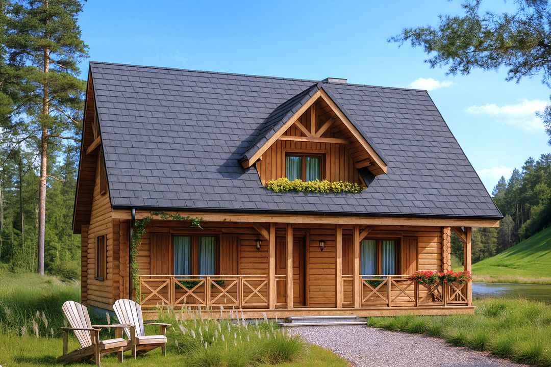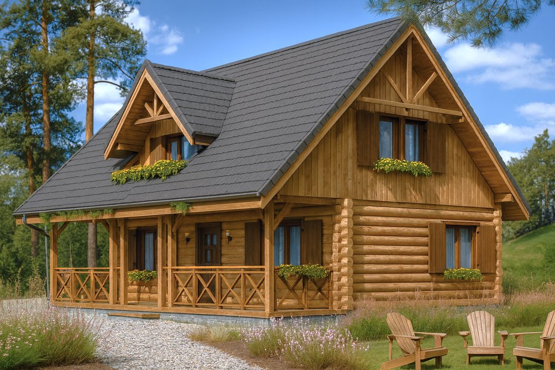 Fundamenty: betonowe wylewane. Ściany zewnętrzne: bale lite 16 cm + docieplenie wełną + szalówka od wewnątrz. Strop: drewniany belkowy. Elewacje: bale lite. Pokrycie dachu: blachodachówka lub dachówka. Nachylenie dachu: 45 stopni.