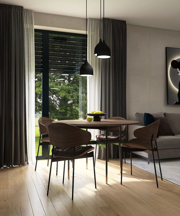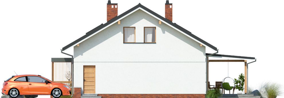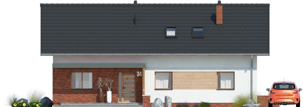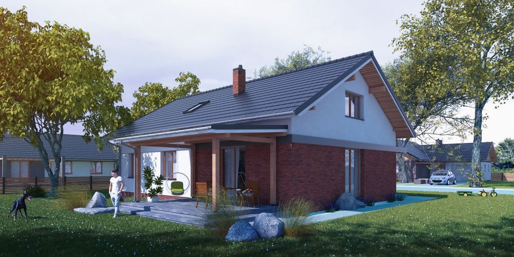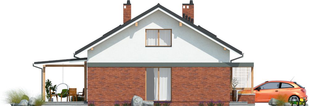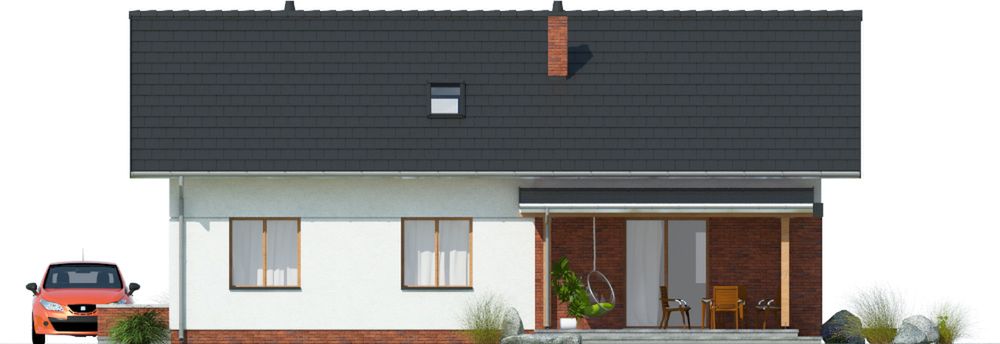 Graficzne opracowanie rzutów poglądowych widocznych na karcie projektu zostało wykonane przez Extradom.pl. Prezentowane przez Extradom.pl wizualizacje wykonane zostały przez autora projektu i należy poczytywać je jedynie za przykład i propozycję wykończenia, wizję architektoniczną autora projektu. Ostateczne wykończenie budynku może nastąpić na wiele sposobów. Szczegółowe rozwiązania zastosowane w oferowanej dokumentacji - w tym również ilość, lokalizacje i wygląd okien, drzwi, kominów - mogą w niewielkim stopniu różnić się od prezentowanej wizualizacji budynku.