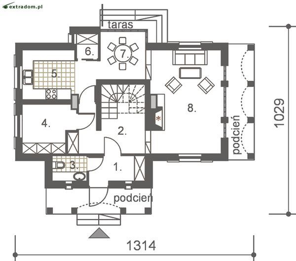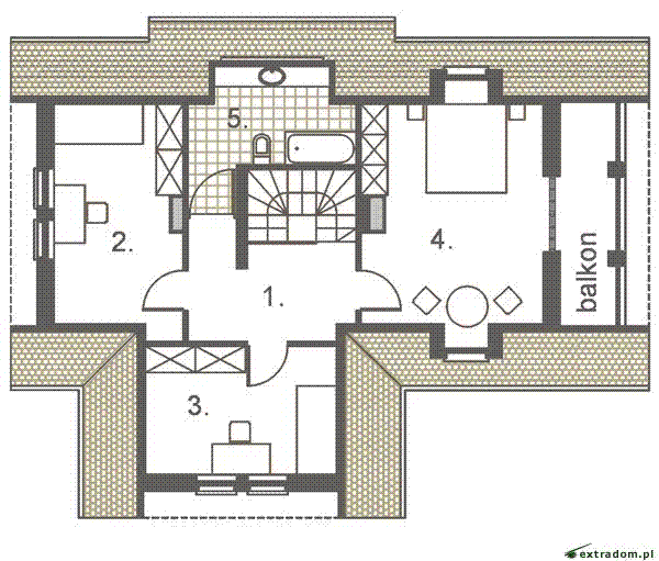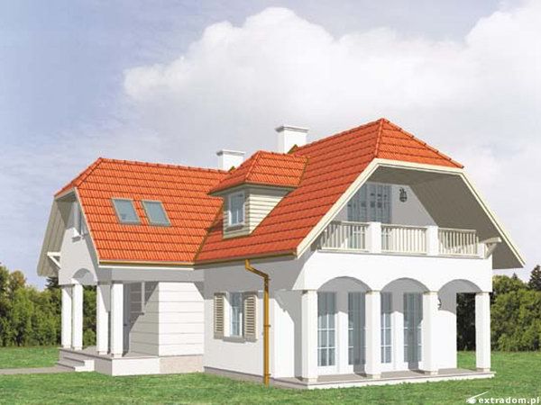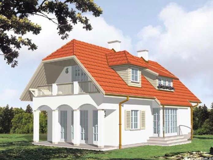 Graficzne opracowanie rzutów poglądowych widocznych na karcie projektu zostało wykonane przez Extradom.pl. Prezentowane przez Extradom.pl wizualizacje wykonane zostały przez autora projektu i należy poczytywać je jedynie za przykład i propozycję wykończenia, wizję architektoniczną autora projektu. Ostateczne wykończenie budynku może nastąpić na wiele sposobów. Szczegółowe rozwiązania zastosowane w oferowanej dokumentacji - w tym również ilość, lokalizacje i wygląd okien, drzwi, kominów - mogą w niewielkim stopniu różnić się od prezentowanej wizualizacji budynku.
