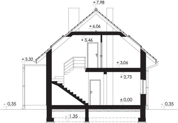 Ściany zewnętrzne: pustak ceramiczny firmy LEIER o gr. 25cm + styropian Termo Organika o gr. 20cm + tynk. Schody: płytowe, żelbetowe, monolityczne zabiegowe. Strop: płyta żelbetowa monolityczna. Ściana kolankowa: wysokość 124,5cm. Dach: dwuspadowy, konstrukcja drewniana, pokryty dachówką ceramiczną lub betonową mocowaną do łat. Stropodach nad garażem: stropodach żelbetowy, niewentylowany, pokryty membraną dachową. Źródło ciepła: kocioł gazowy, kominek z płaszczem wodnym na biomasę i zestaw solarny (c.w.u.). Pomieszczenie gospodarcze spełnia wymagania kotłowni na paliwo stałe, w związku z czym na etapie adaptacji istnieje możliwość zmiany sposobu ogrzewania. Wentylacja: grawitacyjna. Stolarka okienna i drzwiowa: okna i drzwi PVC, rolety zewnętrzne, brama garażowa segmentowa.
