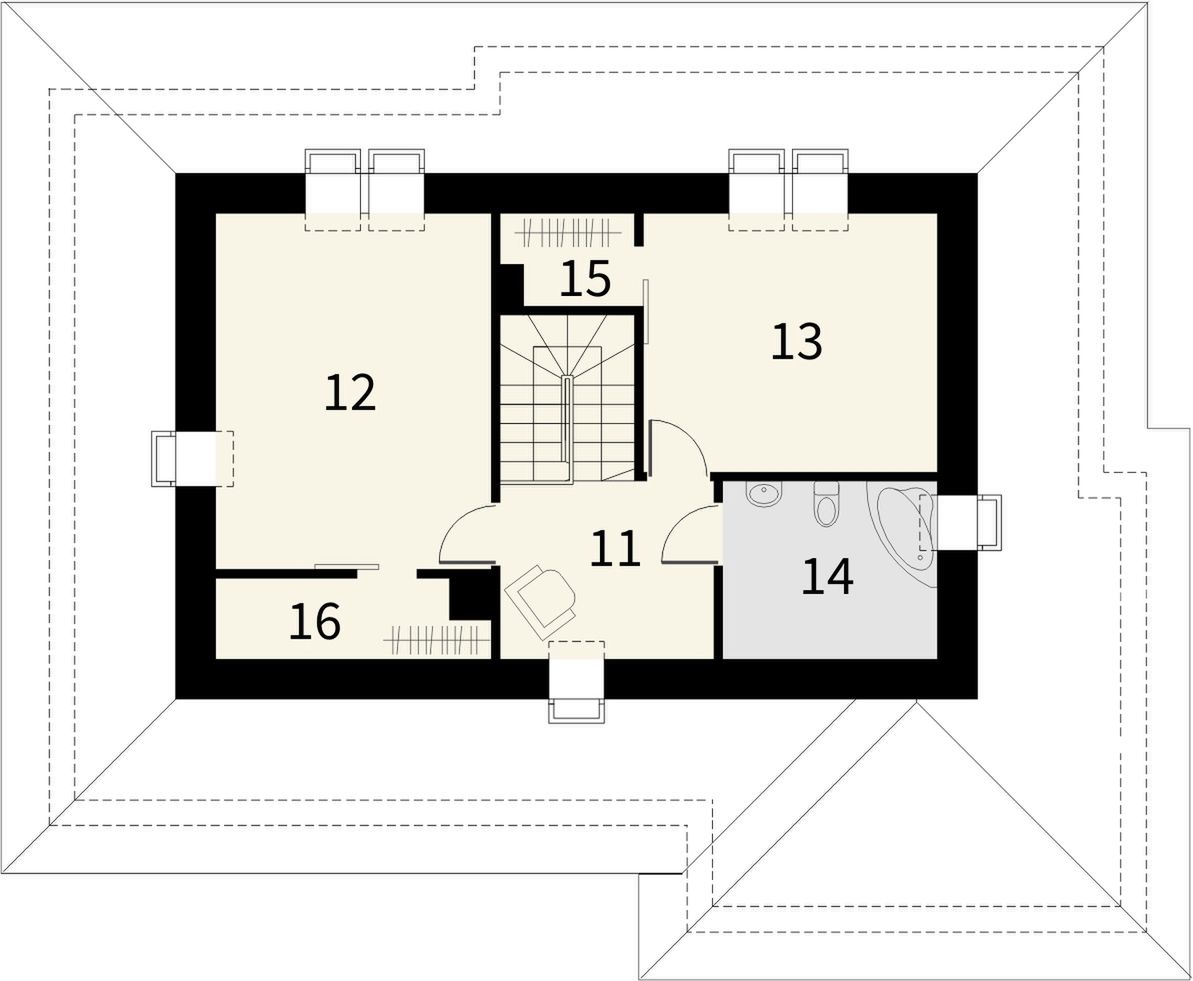 Graficzne opracowanie rzutów poglądowych widocznych na karcie projektu zostało wykonane przez Extradom.pl. Prezentowane przez Extradom.pl wizualizacje wykonane zostały przez autora projektu i należy poczytywać je jedynie za przykład i propozycję wykończenia, wizję architektoniczną autora projektu. Ostateczne wykończenie budynku może nastąpić na wiele sposobów. Szczegółowe rozwiązania zastosowane w oferowanej dokumentacji - w tym również ilość, lokalizacje i wygląd okien, drzwi, kominów - mogą w niewielkim stopniu różnić się od prezentowanej wizualizacji budynku.
