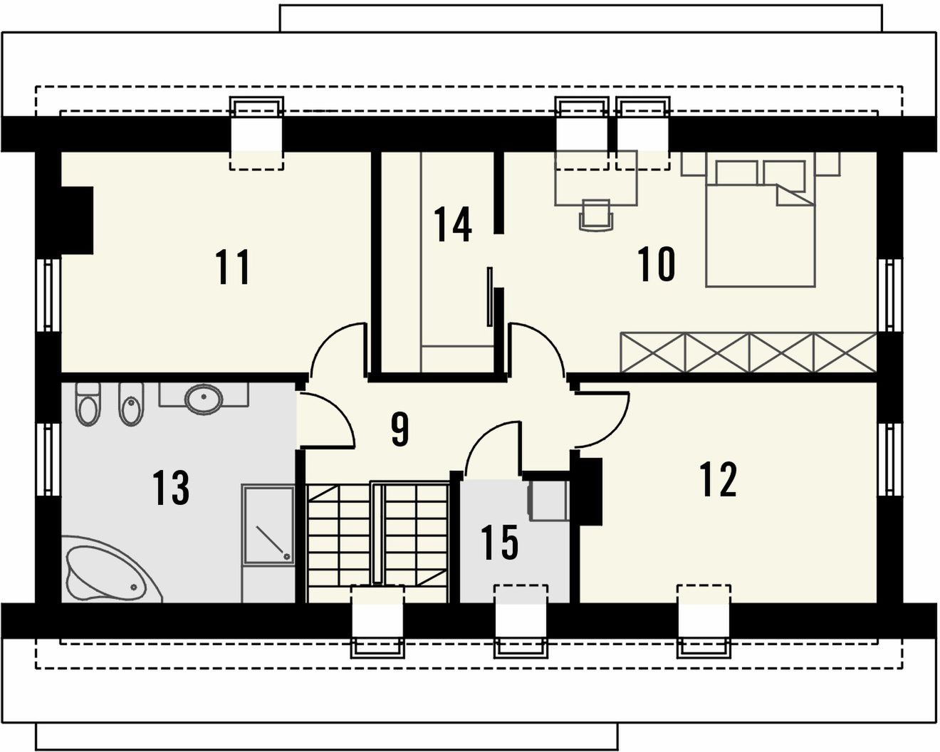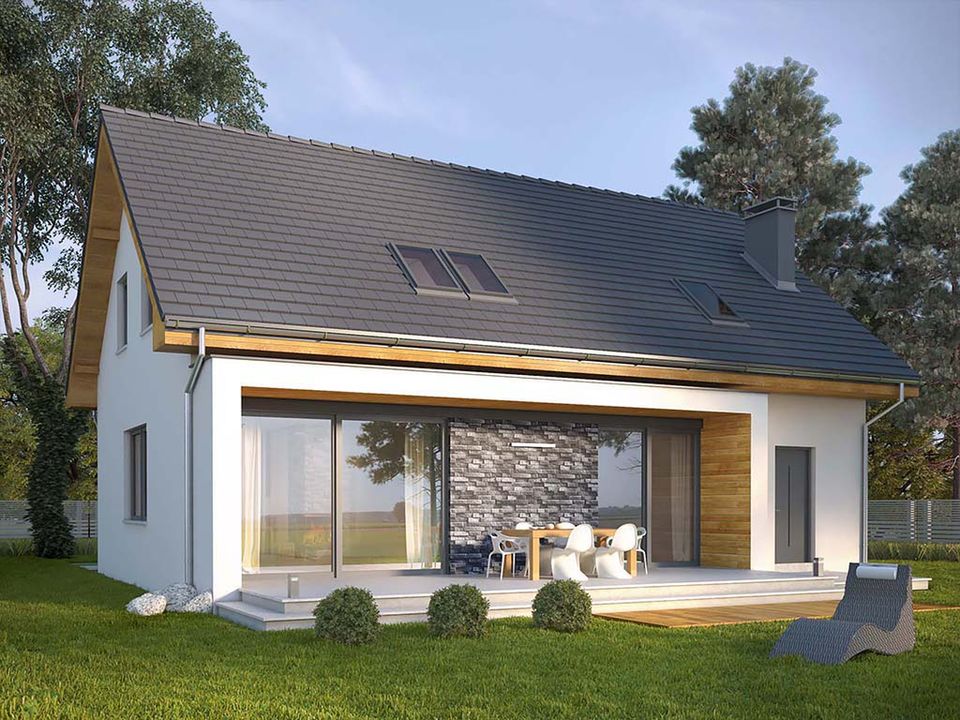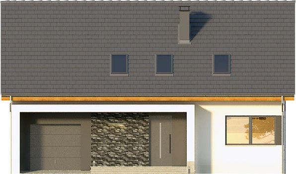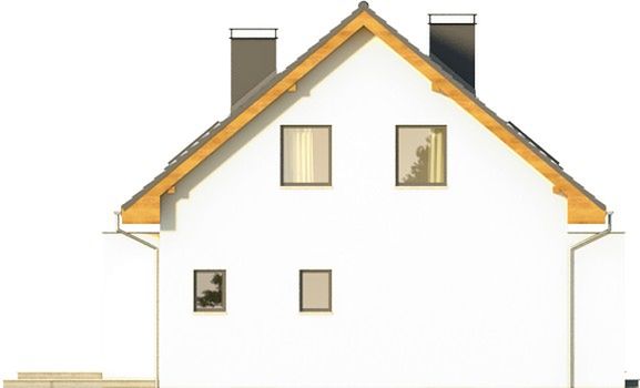 Graficzne opracowanie rzutów poglądowych widocznych na karcie projektu zostało wykonane przez Extradom.pl. Prezentowane przez Extradom.pl wizualizacje wykonane zostały przez autora projektu i należy poczytywać je jedynie za przykład i propozycję wykończenia, wizję architektoniczną autora projektu. Ostateczne wykończenie budynku może nastąpić na wiele sposobów. Szczegółowe rozwiązania zastosowane w oferowanej dokumentacji - w tym również ilość, lokalizacje i wygląd okien, drzwi, kominów - mogą w niewielkim stopniu różnić się od prezentowanej wizualizacji budynku.