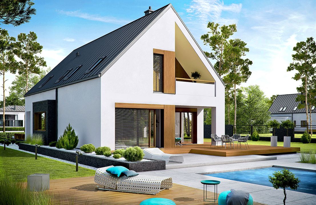 Ściany zewnętrzne: murowane, dwuwarstwowe, beton komórkowy firmy H+H 24 cm, ocieplenie styropian Termo Organika 20 cm. Strop: międzypiętrowy gęstożebrowy Teriva. Dach: konstrukcja drewniana, ocieplenie wełna mineralna ISOVER 30 cm, blacha na rąbek stojący firmy Ruukki. Inne: schody wewnętrzne drewniane. Ogrzewanie: kocioł gazowy kondensacyjny, rozprowadzenie ciepła: grzejniki. Wentylacja: grawitacyjna. Elewacje: tynk cienkowarstwowy mineralny w kolorze TO-PA001 z palety firmy Termo Organika, okładzina z płyty HPL z naturalną okleiną drewnianą firmy Prodema. Stolarka: drewniana, PVC lub aluminiowa, żaluzje zewnętrzne w systemie CleverBox firmy BeClever, drzwi wejściowe i brama garażowa firmy Hörmann. Otoczenie: kwadratowa kostka betonowa z serii VERTIGO firmy Libet w kolorze jasno szarym, system tarasowy ProDeck - deska kompozytowa Terra w kolorze orzech. Okna połaciowe: rozwiązania technologiczne i wyłaz dachowy firmy VELUX.