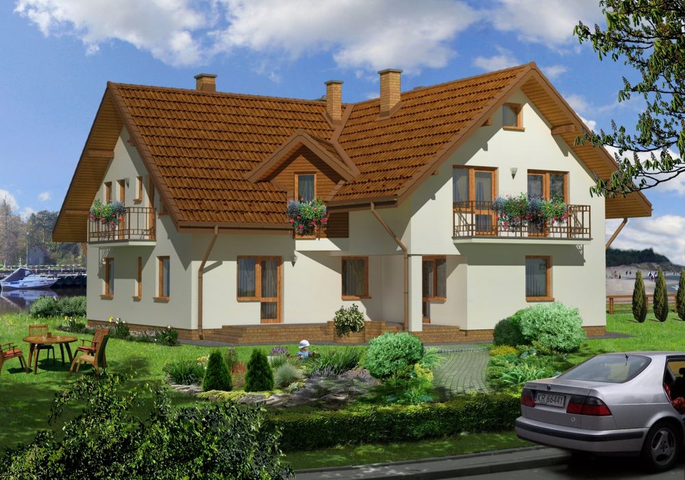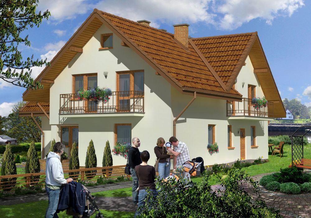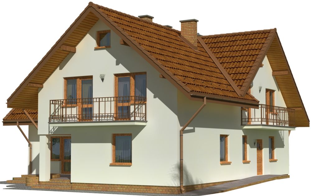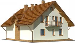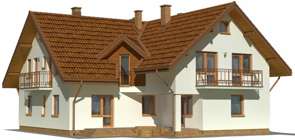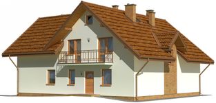 Graficzne opracowanie rzutów poglądowych widocznych na karcie projektu zostało wykonane przez Extradom.pl. Prezentowane przez Extradom.pl wizualizacje wykonane zostały przez autora projektu i należy poczytywać je jedynie za przykład i propozycję wykończenia, wizję architektoniczną autora projektu. Ostateczne wykończenie budynku może nastąpić na wiele sposobów. Szczegółowe rozwiązania zastosowane w oferowanej dokumentacji - w tym również ilość, lokalizacje i wygląd okien, drzwi, kominów - mogą w niewielkim stopniu różnić się od prezentowanej wizualizacji budynku.