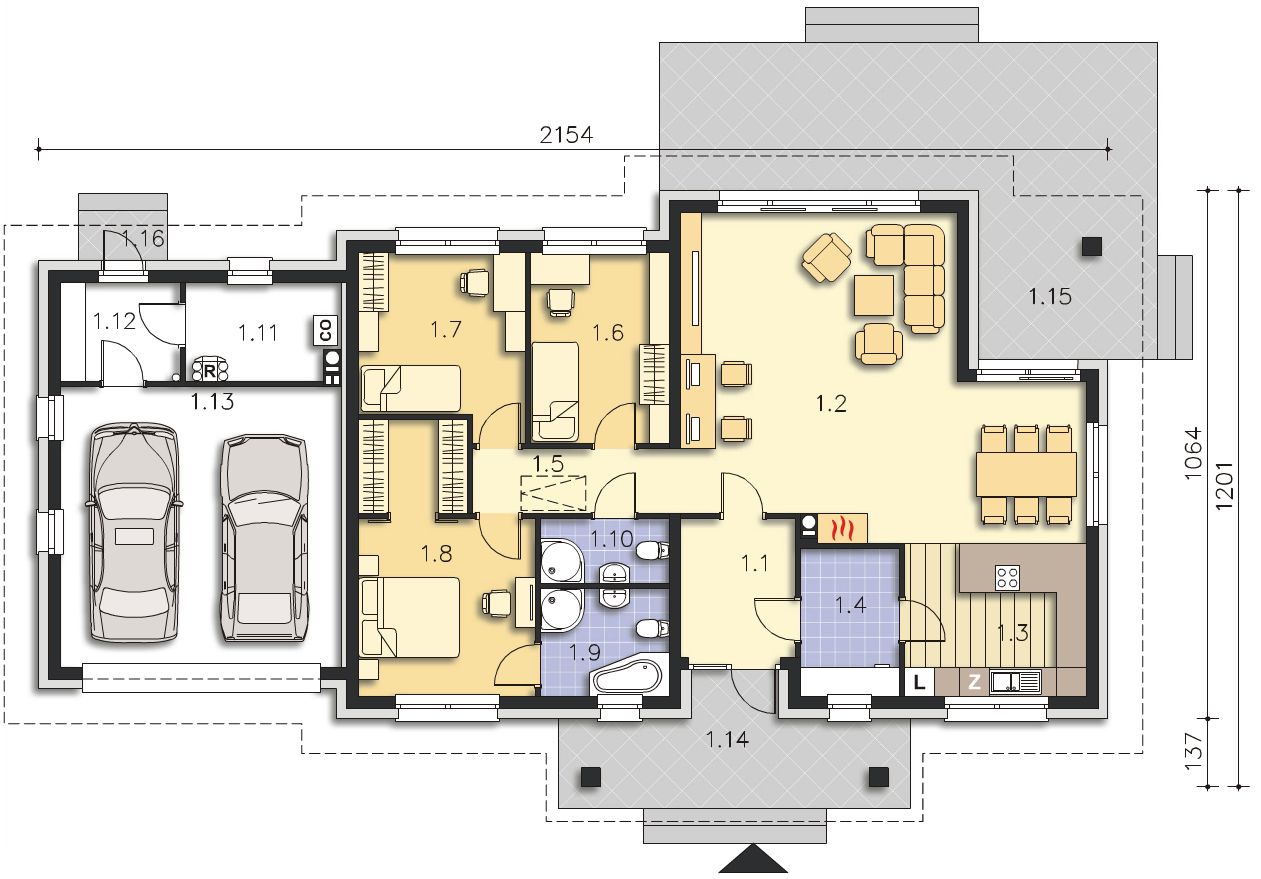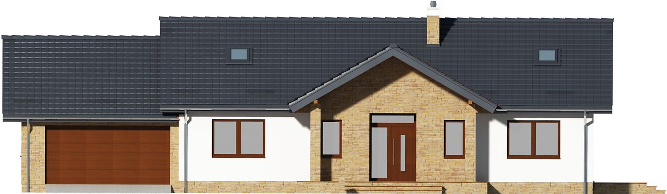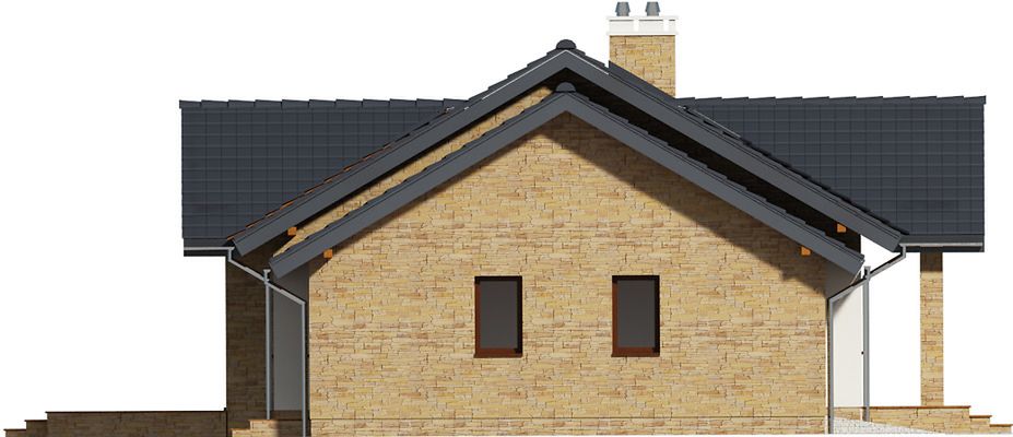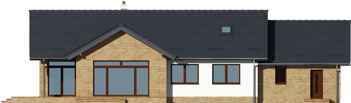 Graficzne opracowanie rzutów poglądowych widocznych na karcie projektu zostało wykonane przez Extradom.pl. Prezentowane przez Extradom.pl wizualizacje wykonane zostały przez autora projektu i należy poczytywać je jedynie za przykład i propozycję wykończenia, wizję architektoniczną autora projektu. Ostateczne wykończenie budynku może nastąpić na wiele sposobów. Szczegółowe rozwiązania zastosowane w oferowanej dokumentacji - w tym również ilość, lokalizacje i wygląd okien, drzwi, kominów - mogą w niewielkim stopniu różnić się od prezentowanej wizualizacji budynku.