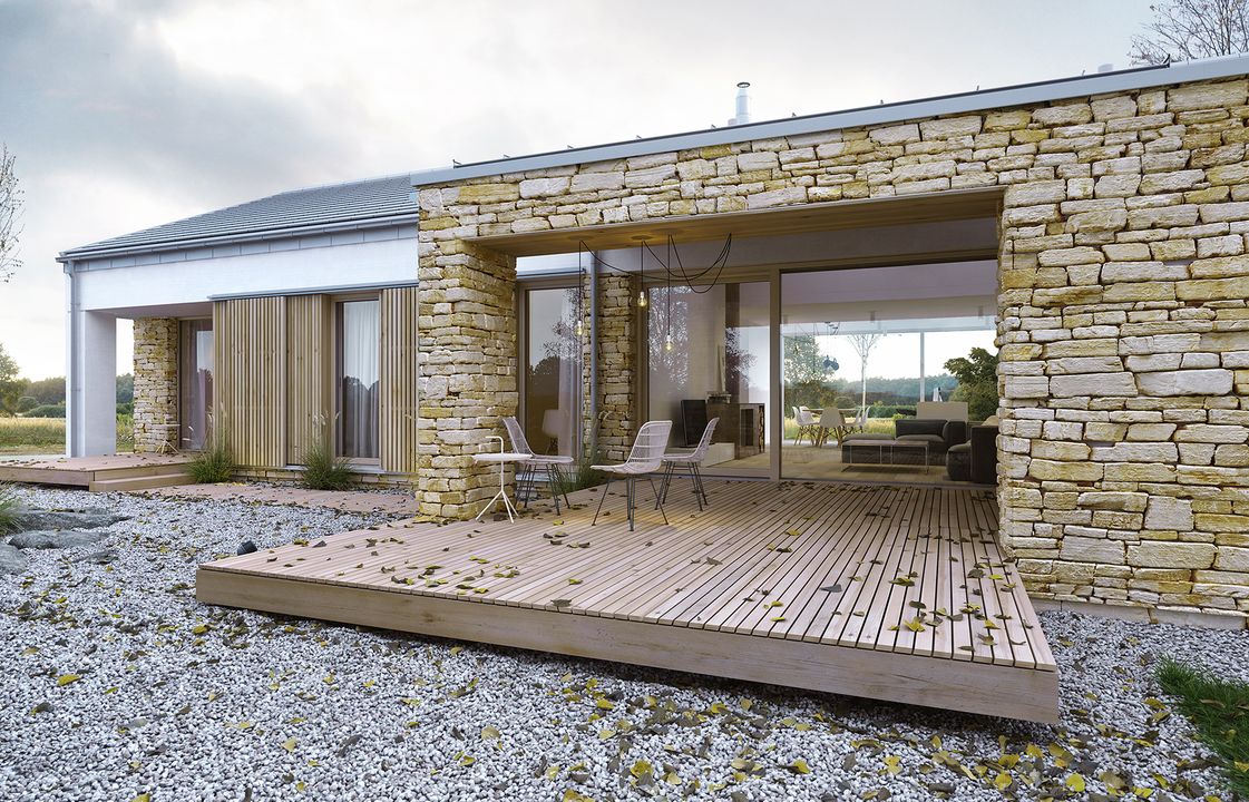 Konstrukcja: zgodna z normami EUROKOD. Fundamenty: tradycyjne ławy i stopy żelbetowe. Ściany: bloczek silikatowy + styropian na etapie adaptacji projektu istnieje możliwość zamiany bloczka silikatowego na inny materiał o podobnych parametrach wytrzymałosciowych, np. na pustak ceramiczny. Elewacja: tynk, kamień łupany, deska elewacyjna kamień łupany wykorzystany jako materiał dekoracyjny można zamienić na etapie adaptacji projektu na inny, np. na płytkę klinkierową. Stropy: żelbetowe wylewane na etapie adaptacji projektu istnieje możliwość zmiany technologii stropu na gęstożebrowy lub prefabrykowany. Dach: dachówka ceramiczna lub cementowa konstrukcja więźby przewidziana pod pokrycie ciężkie dla I strefy wiatrowej i II strefy śniegowej.