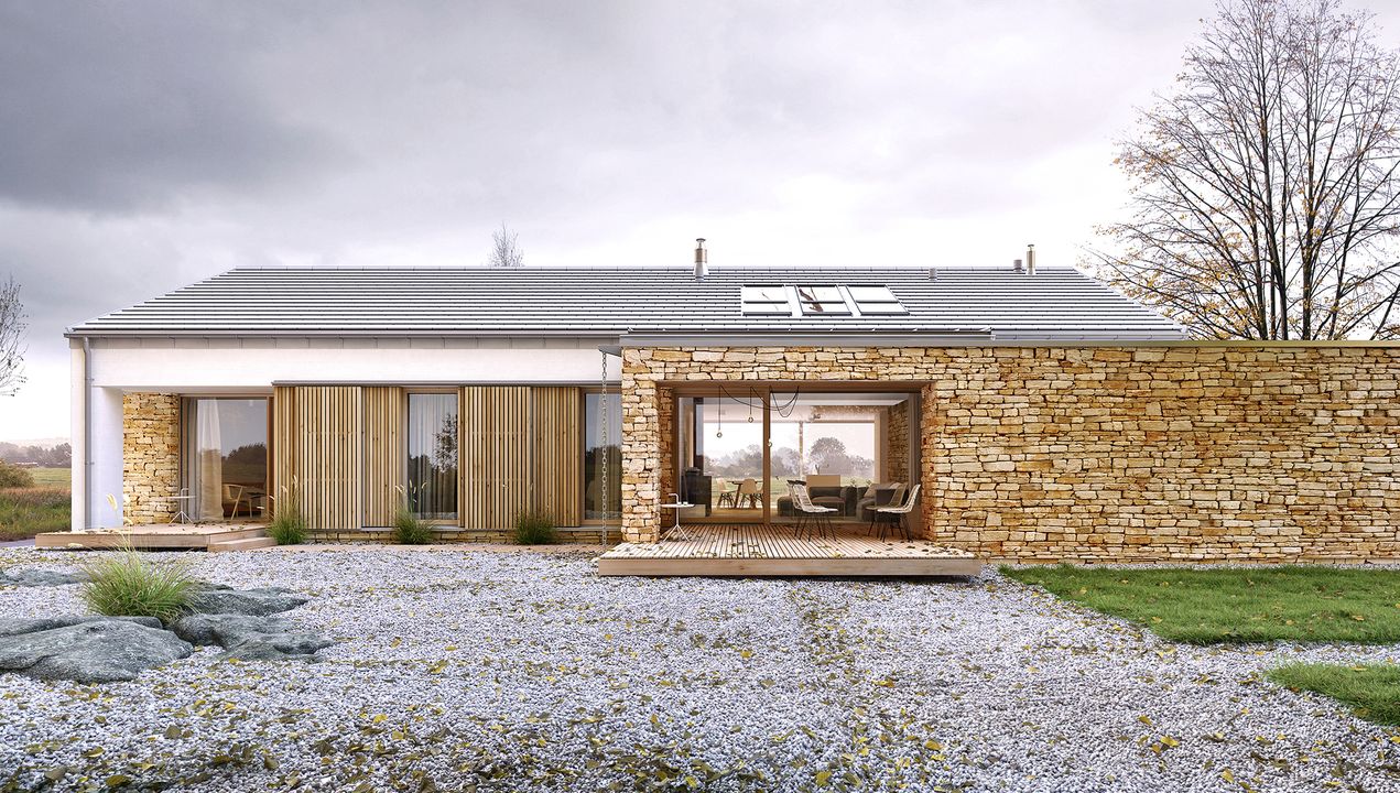 Graficzne opracowanie rzutów poglądowych widocznych na karcie projektu zostało wykonane przez Extradom.pl. Prezentowane przez Extradom.pl wizualizacje wykonane zostały przez autora projektu i należy poczytywać je jedynie za przykład i propozycję wykończenia, wizję architektoniczną autora projektu. Ostateczne wykończenie budynku może nastąpić na wiele sposobów. Szczegółowe rozwiązania zastosowane w oferowanej dokumentacji - w tym również ilość, lokalizacje i wygląd okien, drzwi, kominów - mogą w niewielkim stopniu różnić się od prezentowanej wizualizacji budynku.