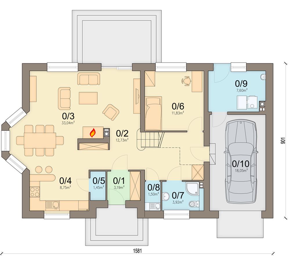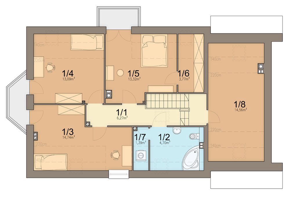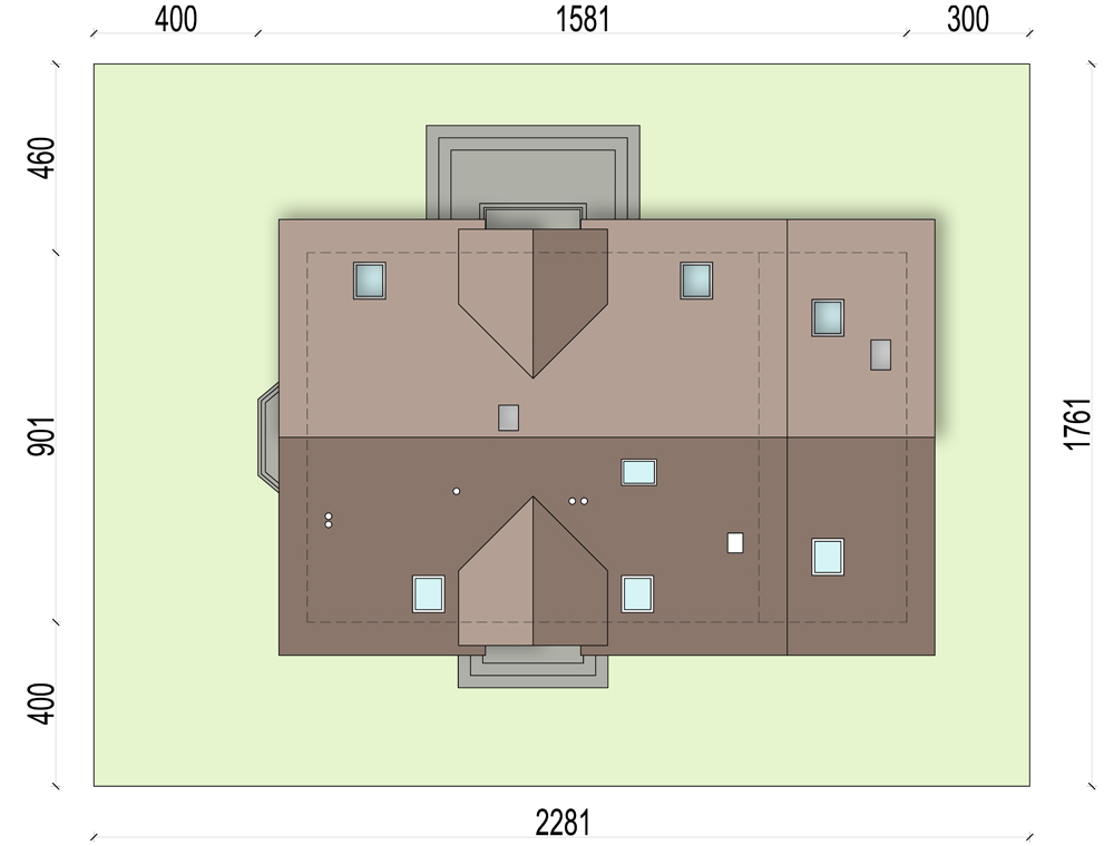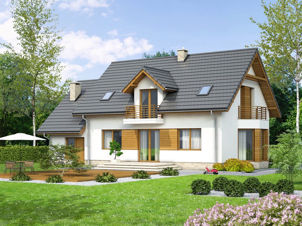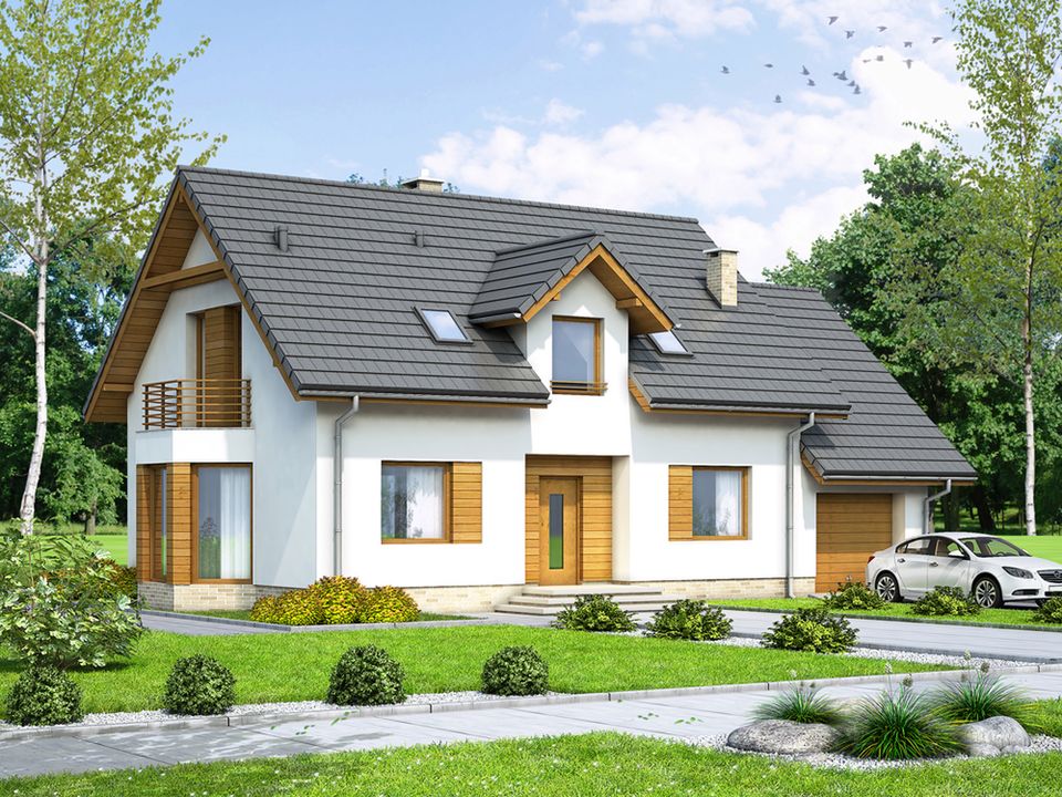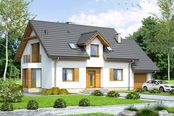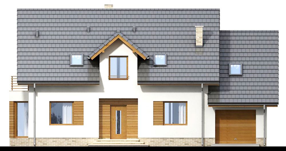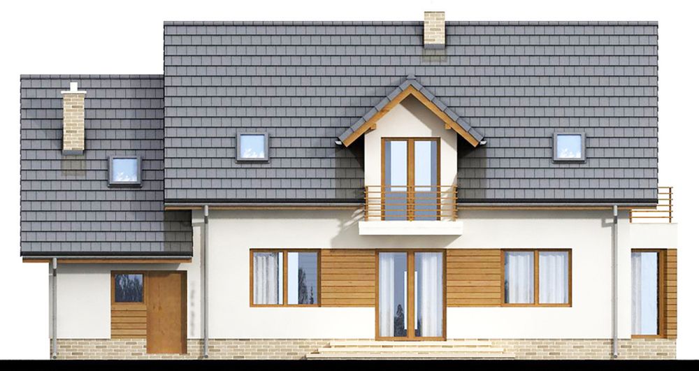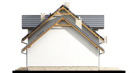 Graficzne opracowanie rzutów poglądowych widocznych na karcie projektu zostało wykonane przez Extradom.pl. Prezentowane przez Extradom.pl wizualizacje wykonane zostały przez autora projektu i należy poczytywać je jedynie za przykład i propozycję wykończenia, wizję architektoniczną autora projektu. Ostateczne wykończenie budynku może nastąpić na wiele sposobów. Szczegółowe rozwiązania zastosowane w oferowanej dokumentacji - w tym również ilość, lokalizacje i wygląd okien, drzwi, kominów - mogą w niewielkim stopniu różnić się od prezentowanej wizualizacji budynku.