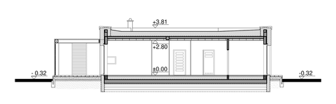 Fundamenty Bezpośrednie, na płycie fundamentowej Ściany zewnętrzne Bloczki z betonu komórkowego H+H gr. 24 cm + styropian gr. 25 cm i 35 cm Ściany wewnętrzne Nośne - bloczki z betonu komórkowego H+H 24 cm Działowe - bloczki z betonu komórkowego H+H 12 cm lub cegła kratówka 12 cm Strop Płyta żelbetowa gr. 18 cm Elewacje Tynk silikonowy na siatce, okładzina elewacyjna drewnopodobna, okładzina z płytek klinkierowych Pokrycie dachu Membrana pcv, blacha stalowa ocynkowana gr. 0,55 mm Konstrukcja dachu Stropodach - płyta żelbetowa gr. 18 cm