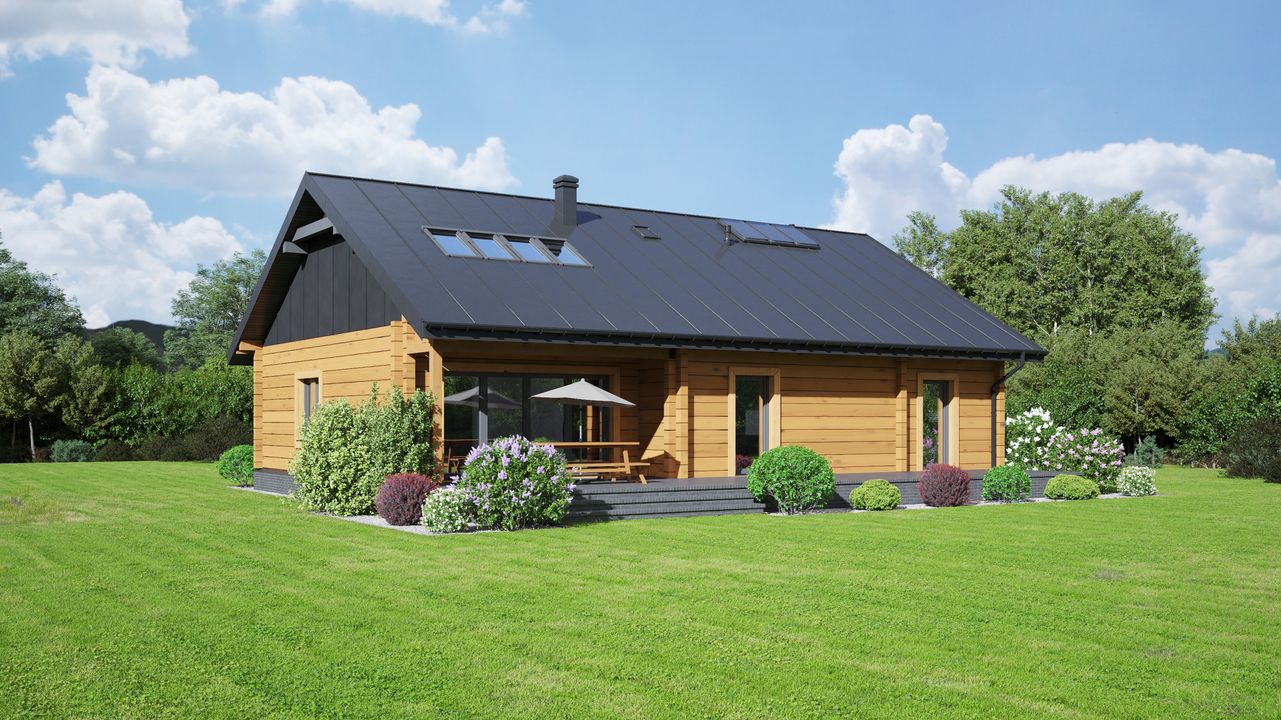 Wysokość ścianki kolankowej: 0.19 m. Strop: drewniany. Pokrycie dachu: blacha na rąbek. Ściany zewnętrzne: płazy drewniane + wełna mineralna + deska. Ściany wewnętrzne: płazy drewniane. Typ ogrzewania: kocioł gazowy. Instalacje dodatkowe: instalacja solarna. Inne: okna dachowe Fakro Greenview.