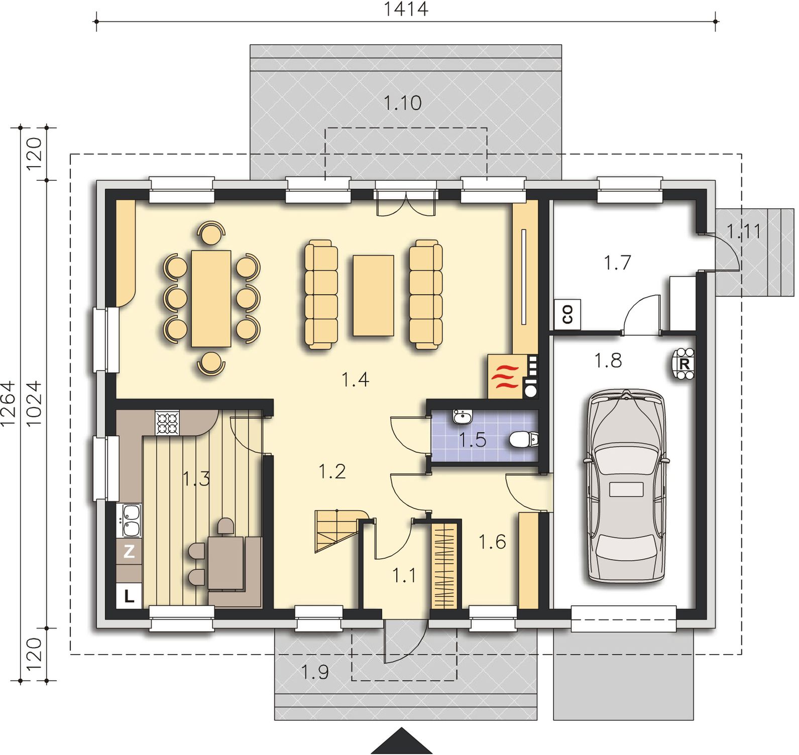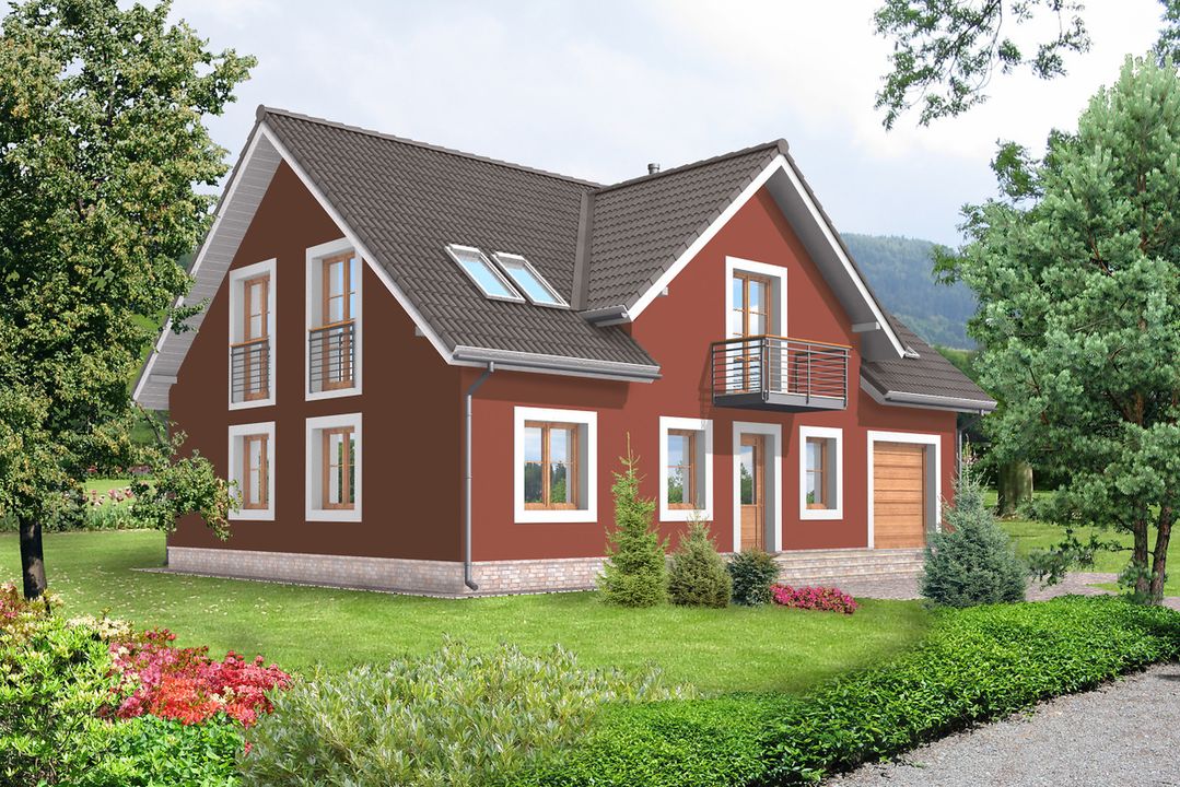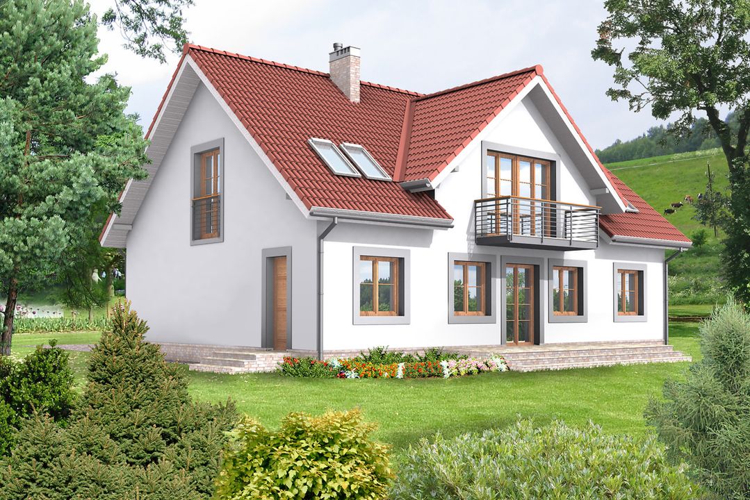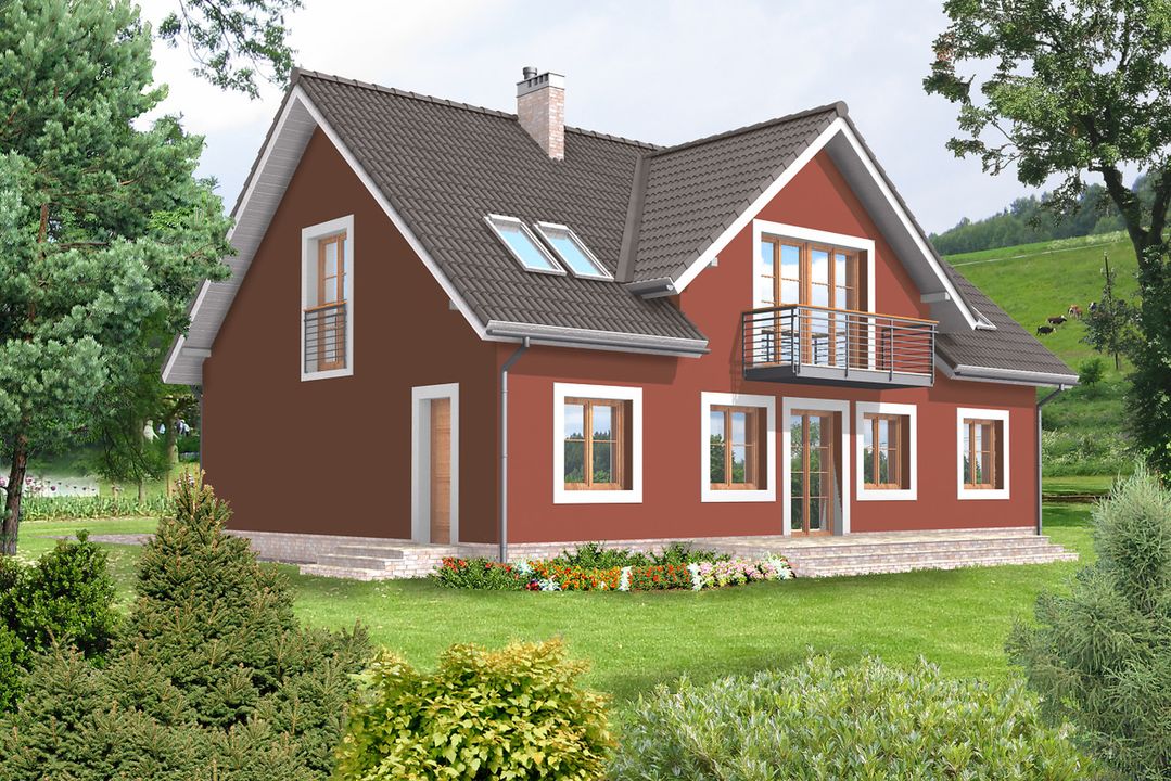 Graficzne opracowanie rzutów poglądowych widocznych na karcie projektu zostało wykonane przez Extradom.pl. Prezentowane przez Extradom.pl wizualizacje wykonane zostały przez autora projektu i należy poczytywać je jedynie za przykład i propozycję wykończenia, wizję architektoniczną autora projektu. Ostateczne wykończenie budynku może nastąpić na wiele sposobów. Szczegółowe rozwiązania zastosowane w oferowanej dokumentacji - w tym również ilość, lokalizacje i wygląd okien, drzwi, kominów - mogą w niewielkim stopniu różnić się od prezentowanej wizualizacji budynku.