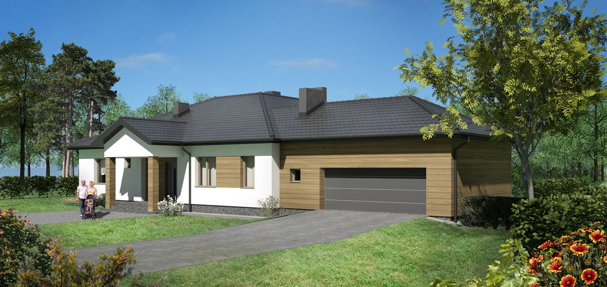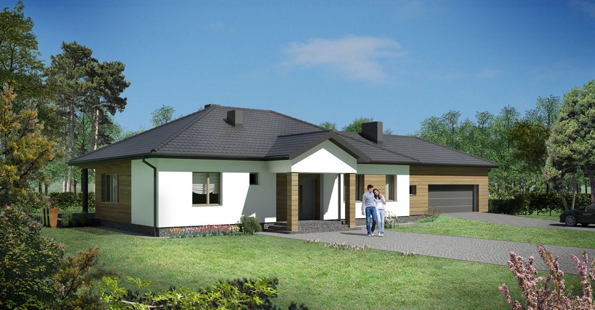 Ściany zewnętrzne: tynk cienkowarstwowy – biały. Ściany zewnętrzne: deski elewacyjne – drewno -brązowy. Cokół: /kominypłytka klinkierowa/ tynk wodoodporny – grafit. Stolarka okienna: pvc/ drewno – grafit. Drzwi zewnętrzne/ brama garażowa: grafit. Obróbki blacharskie: szary. Dach: dachówka betonowa – grafit. Taras/chodnik: kostka betonowa – szary.