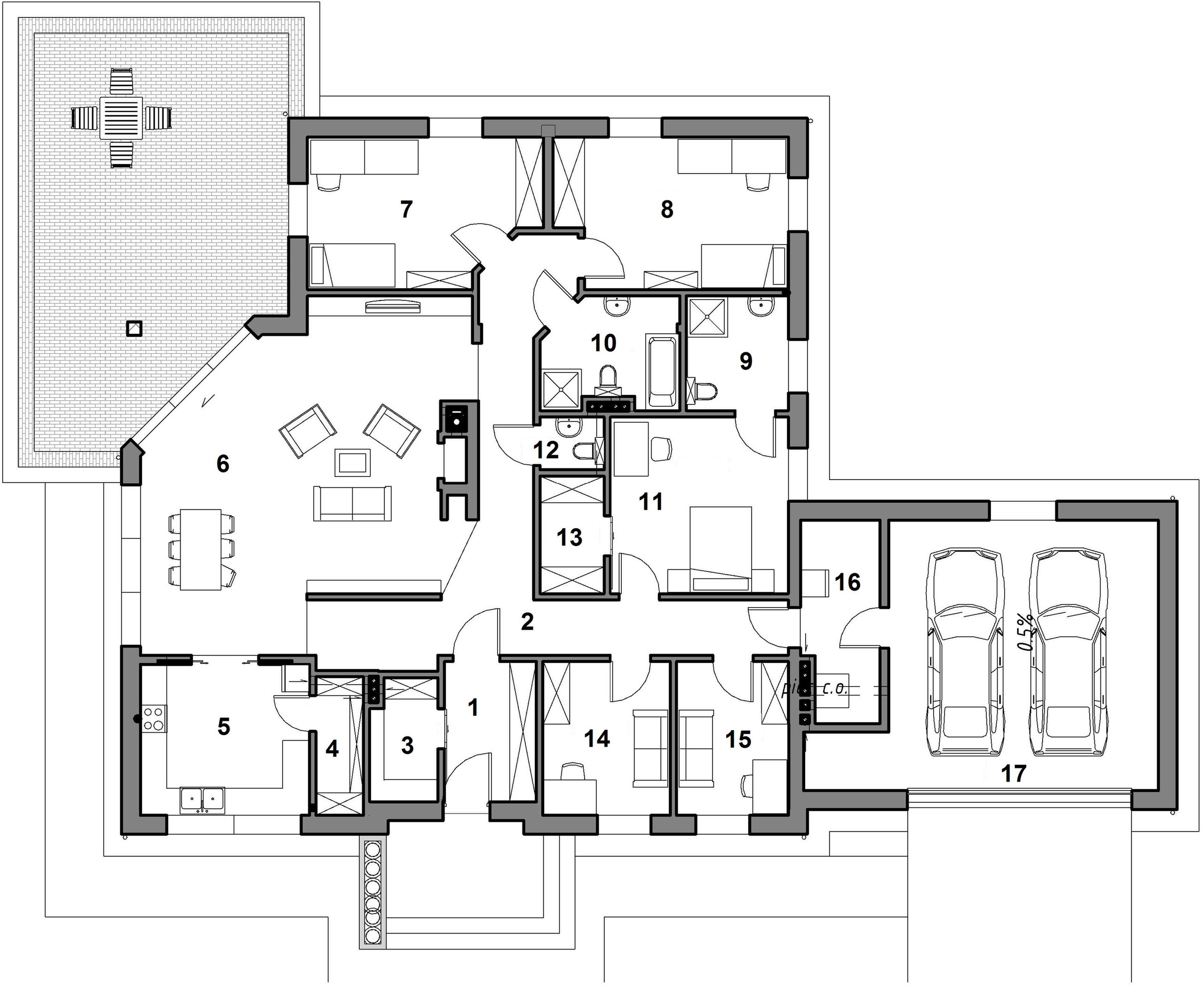 Graficzne opracowanie rzutów poglądowych widocznych na karcie projektu zostało wykonane przez Extradom.pl. Prezentowane przez Extradom.pl wizualizacje wykonane zostały przez autora projektu i należy poczytywać je jedynie za przykład i propozycję wykończenia, wizję architektoniczną autora projektu. Ostateczne wykończenie budynku może nastąpić na wiele sposobów. Szczegółowe rozwiązania zastosowane w oferowanej dokumentacji - w tym również ilość, lokalizacje i wygląd okien, drzwi, kominów - mogą w niewielkim stopniu różnić się od prezentowanej wizualizacji budynku.