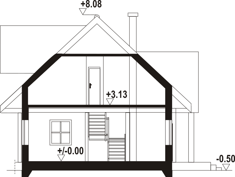 Wysokość ścianki kolankowej: 0.83 m. Strop: drewniany. Pokrycie dachu: dachówka gontopodobna Gerard Corona. Ściany zewnętrzne: płazy drewniane + wełna mineralna + deska. Ściany wewnętrzne: płazy drewniane. Typ ogrzewania: pompa ciepła.