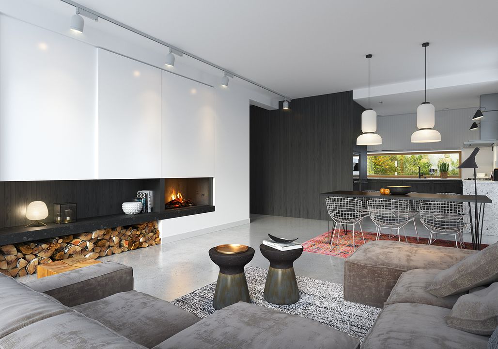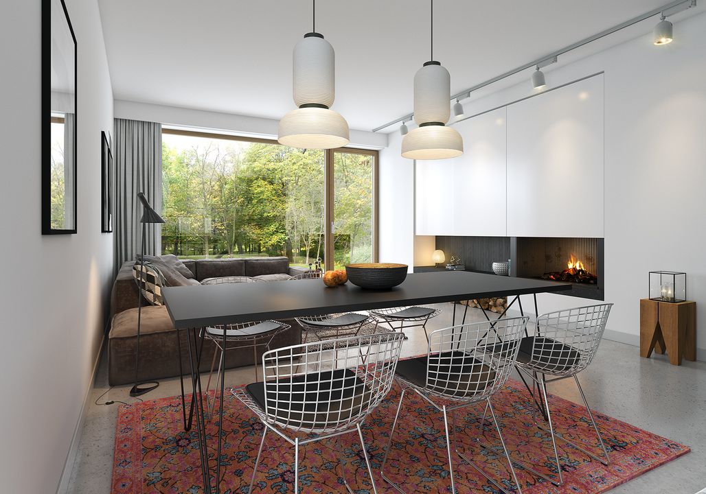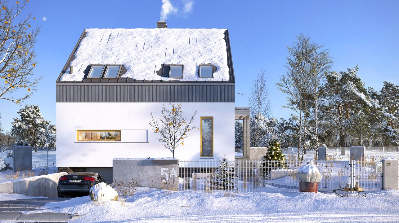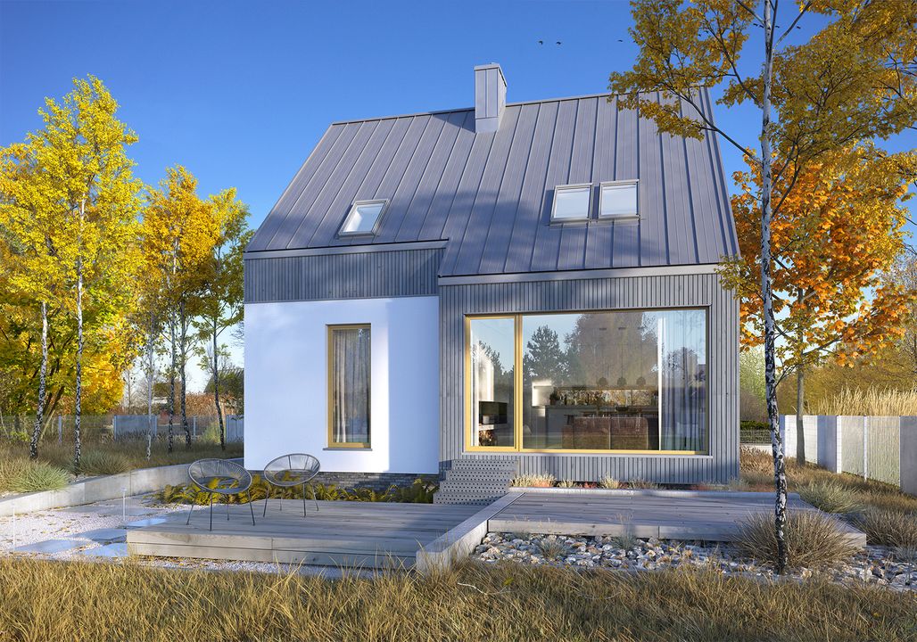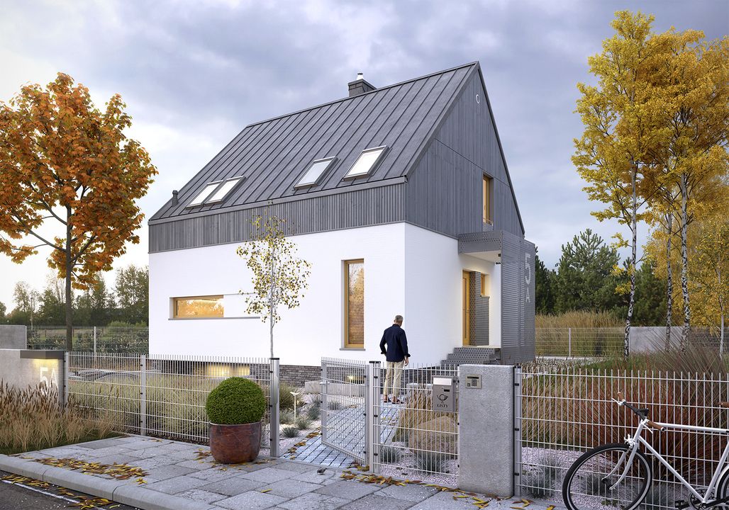 Graficzne opracowanie rzutów poglądowych widocznych na karcie projektu zostało wykonane przez Extradom.pl. Prezentowane przez Extradom.pl wizualizacje wykonane zostały przez autora projektu i należy poczytywać je jedynie za przykład i propozycję wykończenia, wizję architektoniczną autora projektu. Ostateczne wykończenie budynku może nastąpić na wiele sposobów. Szczegółowe rozwiązania zastosowane w oferowanej dokumentacji - w tym również ilość, lokalizacje i wygląd okien, drzwi, kominów - mogą w niewielkim stopniu różnić się od prezentowanej wizualizacji budynku.