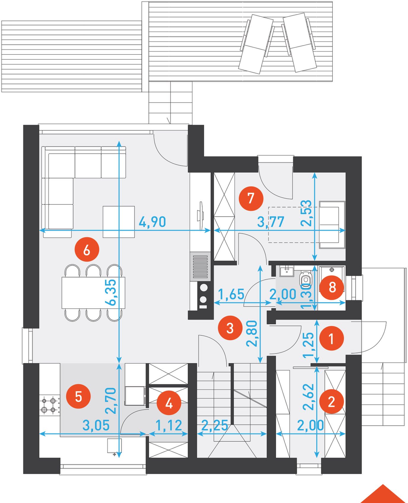 Konstrukcja: zgodna z normami EUROKOD. Fundamenty: tradycyjne ławy i stopy żelbetowe. Ściany: bloczek silikatowy + styropian na etapie adaptacji projektu istnieje możliwość zamiany bloczka silikatowego na inny materiał o podobnych parametrach wytrzymałosciowych, np. na pustak ceramiczny. Elewacja: tynk, deska elewacyjna deskę elewacyjną wykorzystaną jako materiał dekoracyjny można zamienić na etapie adaptacji projektu na inny, np. na płytkę klinkierową. Stropy: żelbetowe wylewane na etapie adaptacji projektu istnieje możliwość zmiany technologii stropu na gęstożebrowy lub prefabrykowany. Schody: żelbetowe Dach: blacha – panel na rąbek konstrukcja więźby przewidziana pod pokrycie ciężkie dla I strefy wiatrowej i II strefy śniegowej.