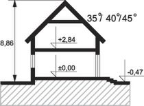 Ściany: 2-warstwowe - pustak ceramiczny + styropian. Stropy: żelbetowe, wylewane. Dach: dachówka ceramiczna CREATON, kąt nachylenia 40° i 35°. Ogrzewanie: gazowe, olejowe.