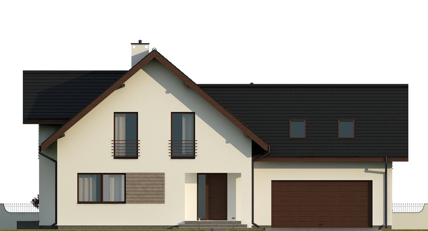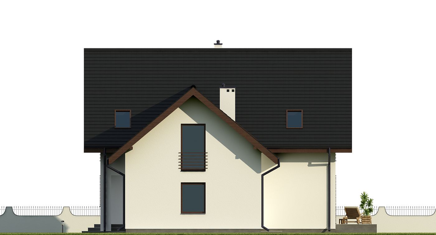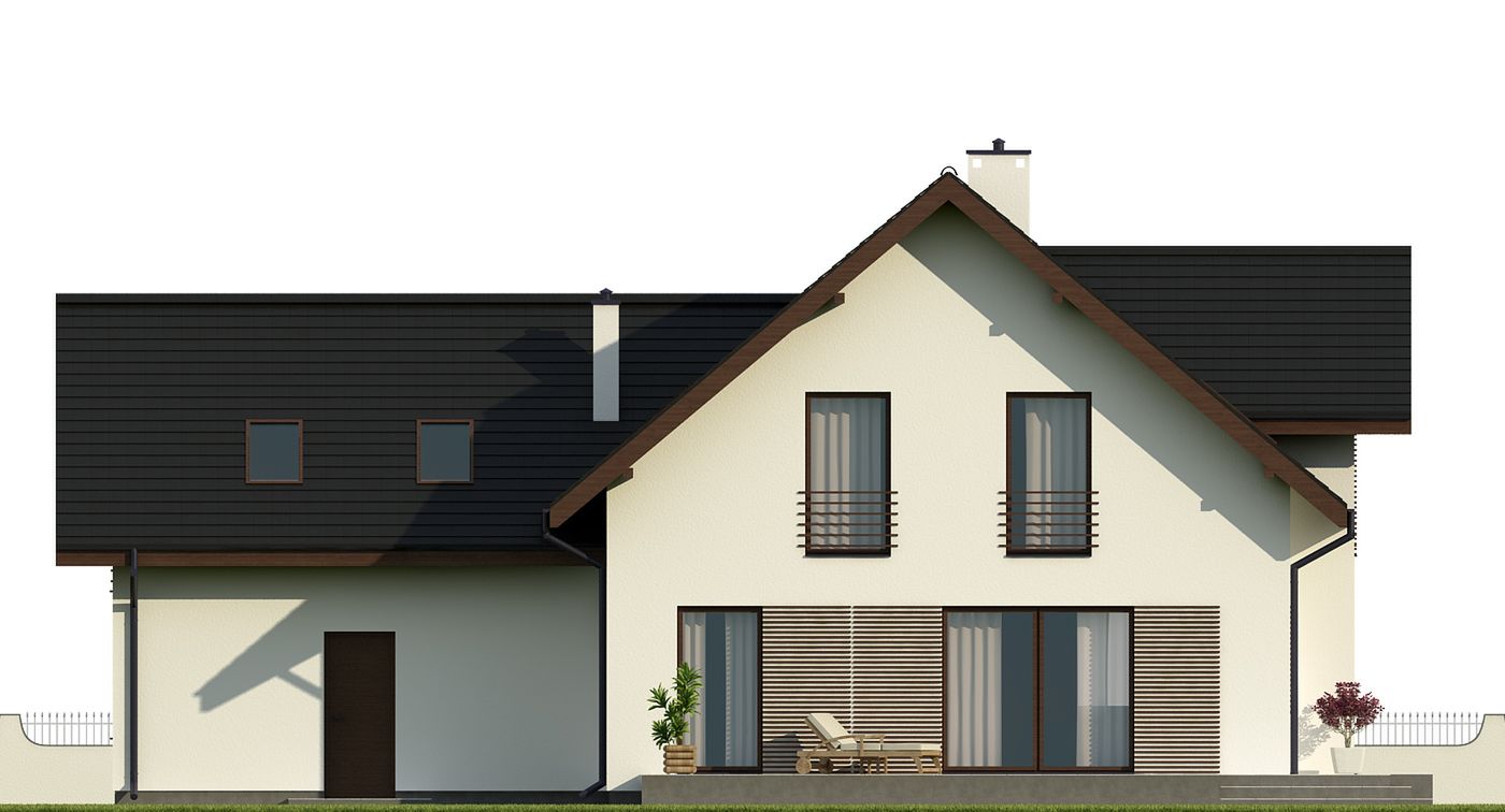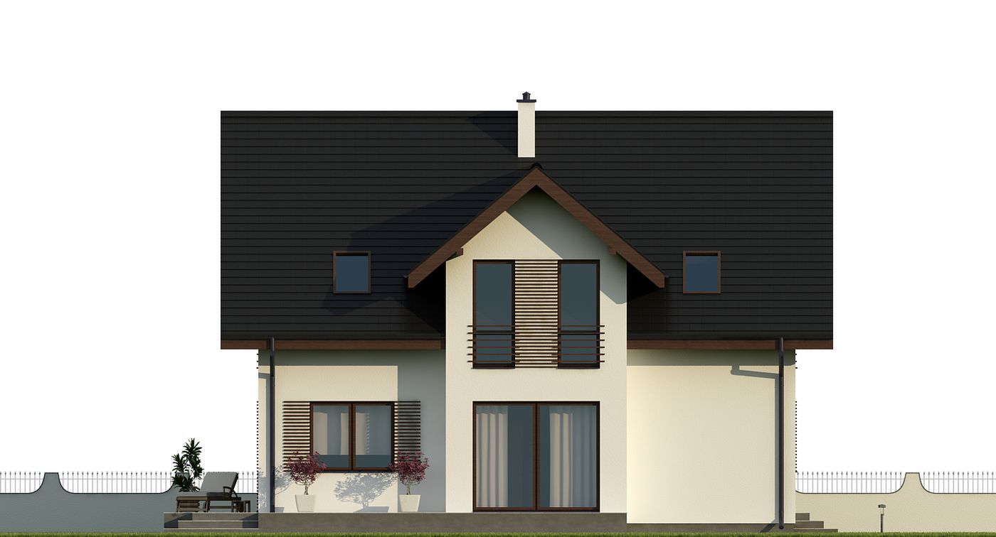 Graficzne opracowanie rzutów poglądowych widocznych na karcie projektu zostało wykonane przez Extradom.pl. Prezentowane przez Extradom.pl wizualizacje wykonane zostały przez autora projektu i należy poczytywać je jedynie za przykład i propozycję wykończenia, wizję architektoniczną autora projektu. Ostateczne wykończenie budynku może nastąpić na wiele sposobów. Szczegółowe rozwiązania zastosowane w oferowanej dokumentacji - w tym również ilość, lokalizacje i wygląd okien, drzwi, kominów - mogą w niewielkim stopniu różnić się od prezentowanej wizualizacji budynku.
