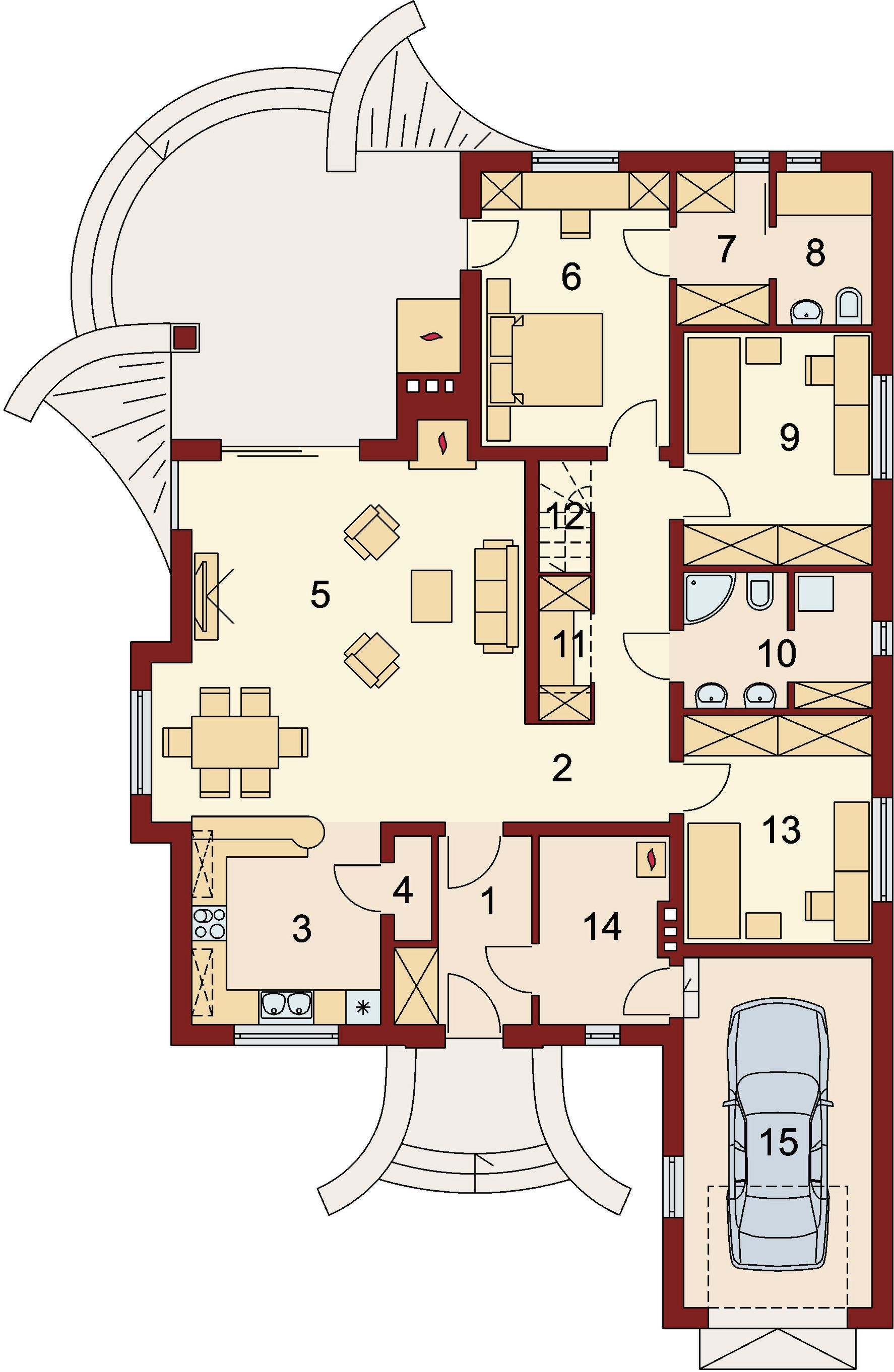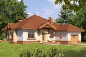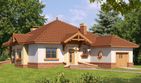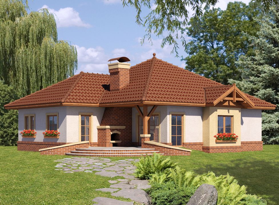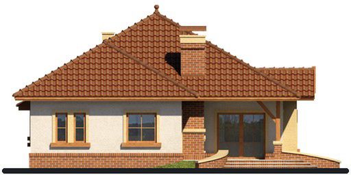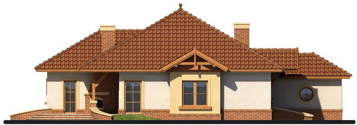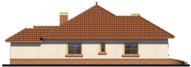 Projekt Rufus to dom parterowy, co jest z pewnością ogromnym plusem w przypadku osób starszych, niepełnosprawnych oraz małżeństw z małymi dziećmi. Zwolenników przestronnych przestrzeni z pewnością ucieszy przewidziana w projekcie część dzienna. Otwarta kuchnia to rozwiązanie dające wiele możliwości aranżacyjnych, zarówno nowoczesnych jak i tradycyjnych. Dodatkowo przewidziana spiżarnia to idealne miejsce na przechowywanie przetworów i zapasów żywności. Połączenie jadalni z salonem sprzyja integracji rodziny. Podczas odpoczynku, rodzice mogą zerkać na bawiące się lub odrabiające lekcje dzieci.Ciekawym elementem jest z pewnością usytuowany w salonie kominek, który nada wnętrzu niepowtarzalny klimat. Autor projektu przewidział w nim dwie łazienki o optymalnych wymiarach. Część nocną tworzą trzy sypialnie, które dobrze sprawdzą się w przypadku 2-4 osobowej rodziny. Przestrzeń można wykorzystać także jako pokój dla gości lub gabinet. Niewątpliwą zaletą projektu są przewidziane w nim funkcjonalne garderoby. W domu nie zabrakło również miejsca na praktyczne zaplecze gospodarcze. Doskonałym miejscem do wypoczynku jest zaprojektowany przy domu taras. Projekt został wykonany w technologii murowanej, dzięki czemu podczas upałów dom utrzymuje przyjemny chłód. W jego bryle widoczne są rozwiązania nawiązujące do stylu tradycyjnego, dzięki czemu idealnie wpisze się w dowolny krajobraz.
