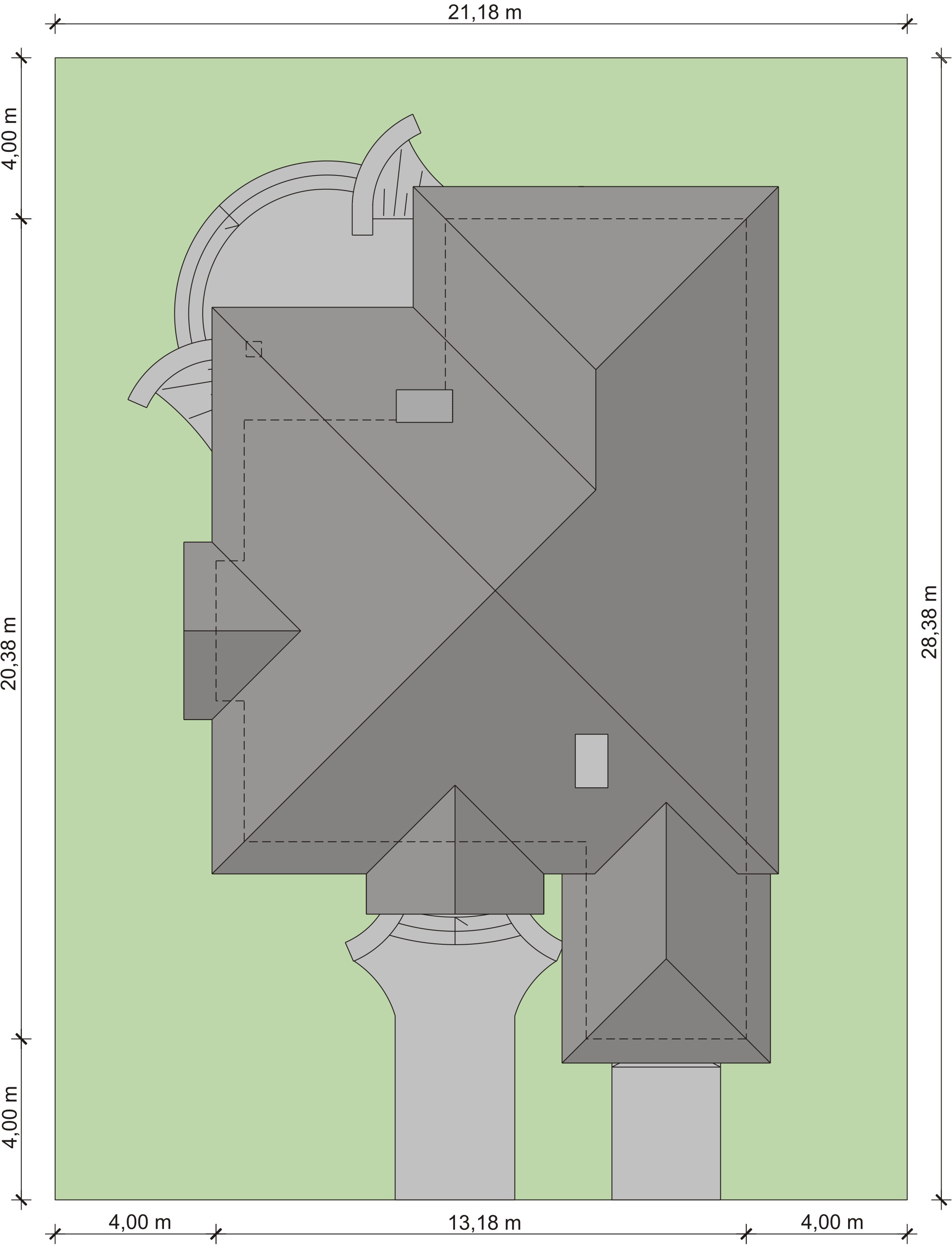 Najmniejsza możliwa długość działki niezbędna do wybudowania wybranego domu. Składa się z długości elewacji domu powiększonej z obu stron o 3 m dla ściany bez otworów drzwiowych/okiennych lub 4 m, dla ściany z otworami.