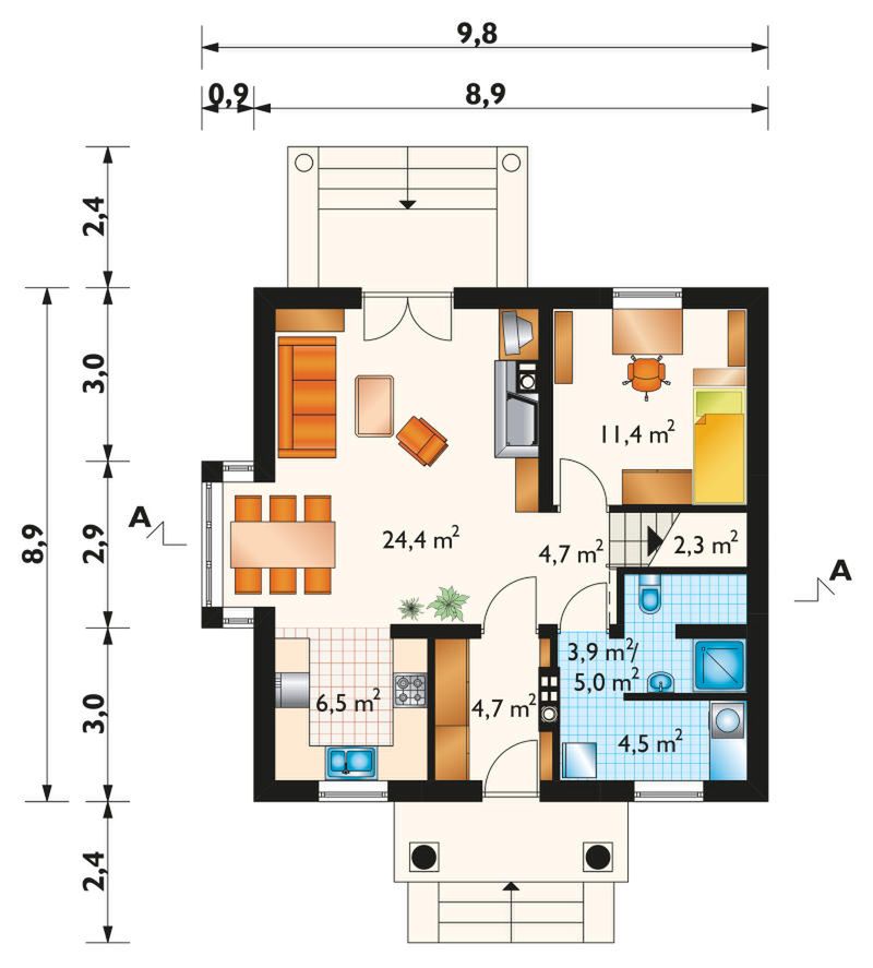 Graficzne opracowanie rzutów poglądowych widocznych na karcie projektu zostało wykonane przez Extradom.pl. Prezentowane przez Extradom.pl wizualizacje wykonane zostały przez autora projektu i należy poczytywać je jedynie za przykład i propozycję wykończenia, wizję architektoniczną autora projektu. Ostateczne wykończenie budynku może nastąpić na wiele sposobów. Szczegółowe rozwiązania zastosowane w oferowanej dokumentacji - w tym również ilość, lokalizacje i wygląd okien, drzwi, kominów - mogą w niewielkim stopniu różnić się od prezentowanej wizualizacji budynku.