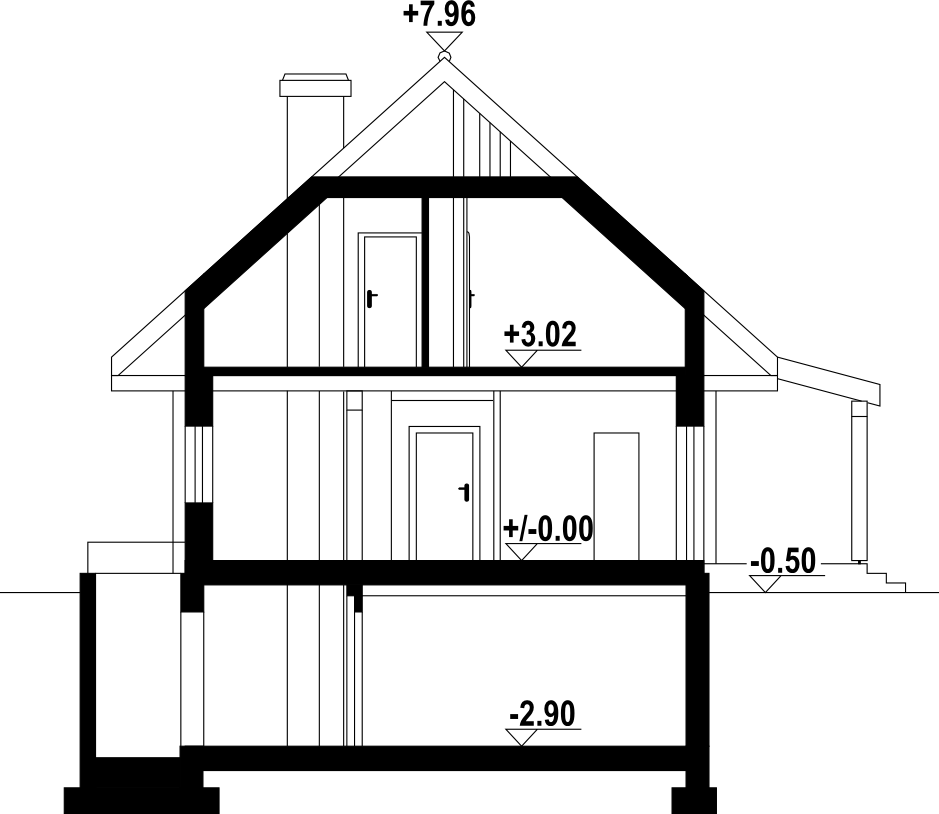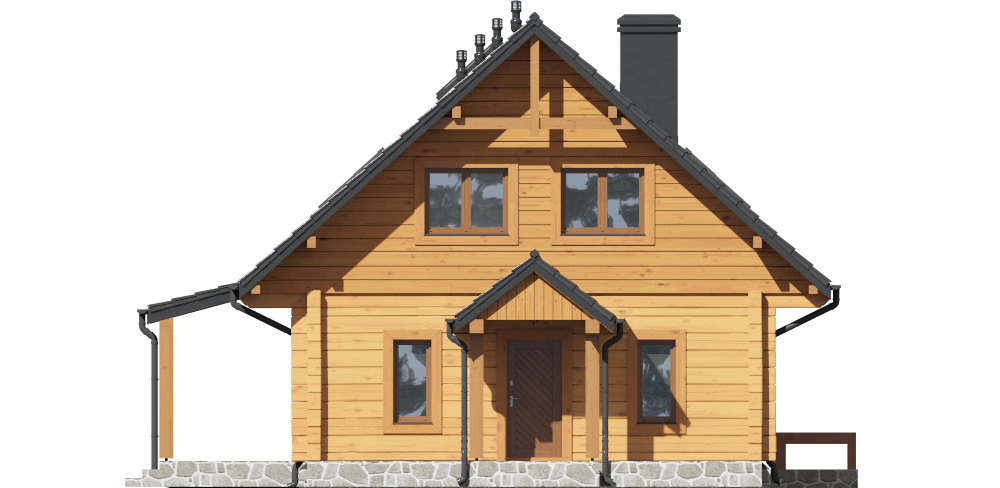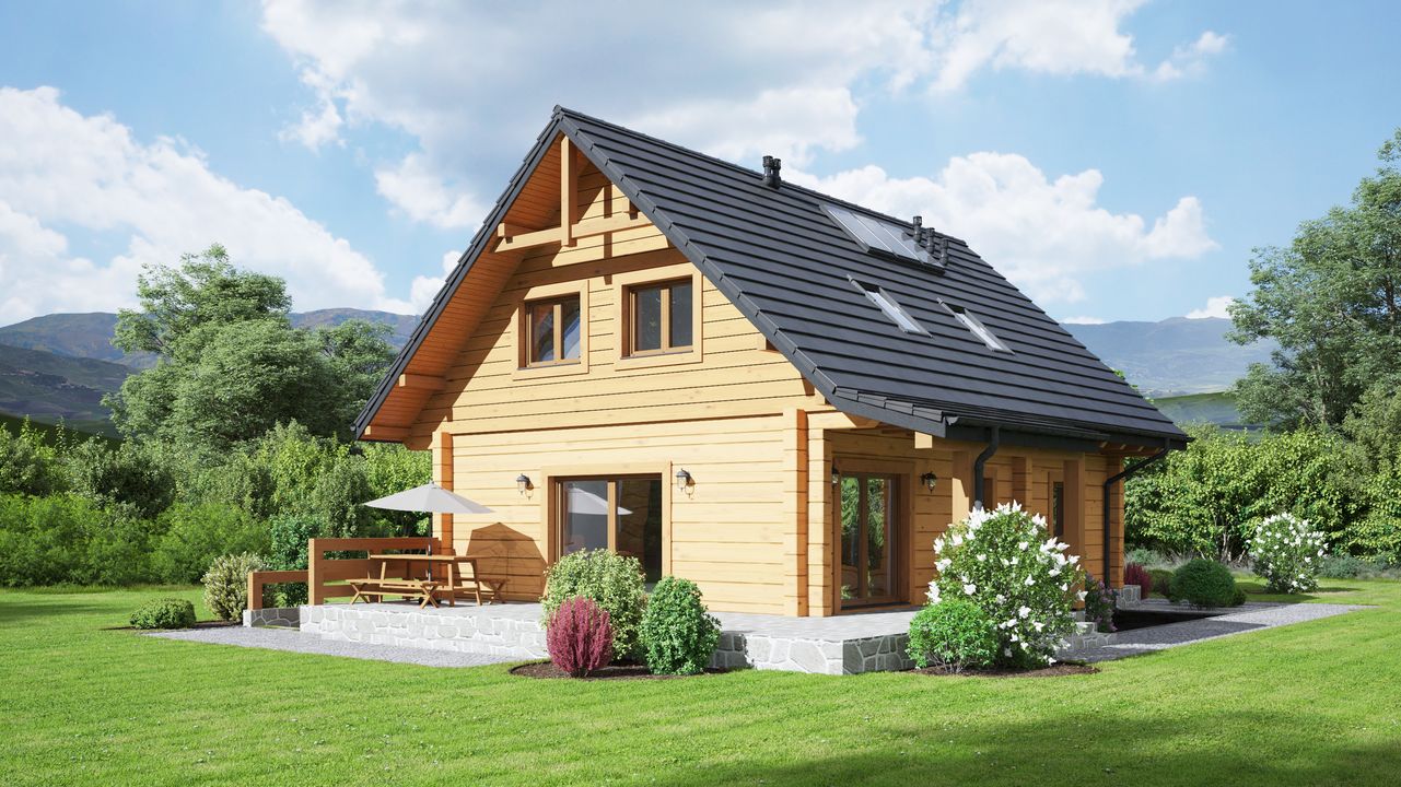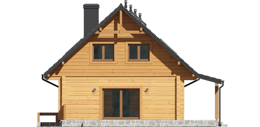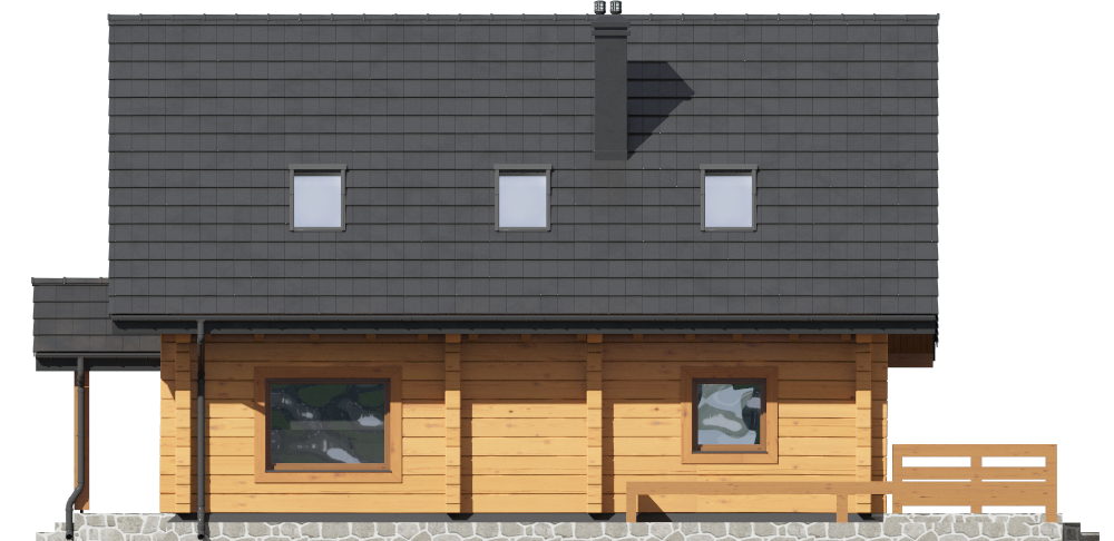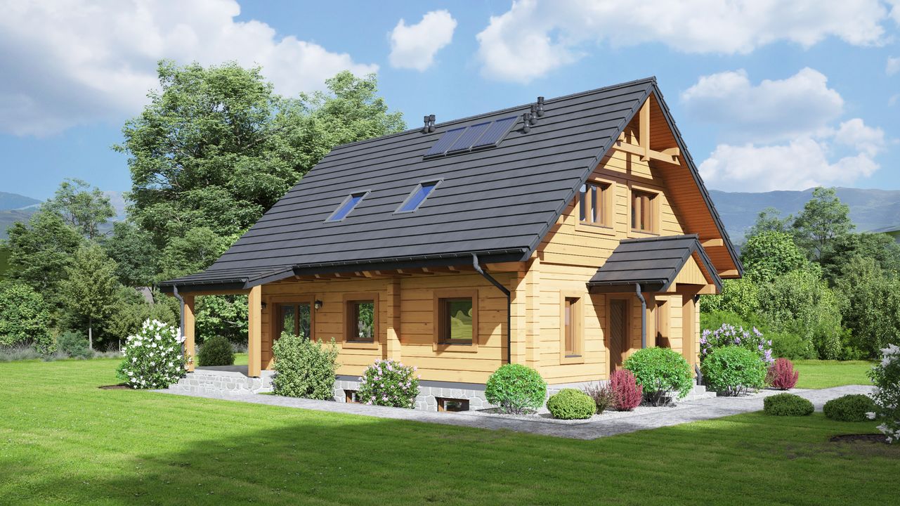 Wysokość ścianki kolankowej: 0.9 m. Strop: żelbet + drewniany. Pokrycie dachu: dachówka ceramiczna. Ściany zewnętrzne: płazy drewniane + wełna mineralna + deska. Ściany wewnętrzne: płazy drewniane. Typ ogrzewania: kocioł gazowy lub kocioł na paliwo stałe. Instalacje dodatkowe: instalacja solarna. Inne: okna połaciowe Velux.