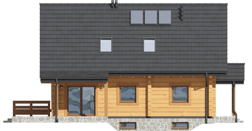Projekt Rydzów dw 9 charakteryzuje się prostą, zwartą bryłą przykrytą klasycznym, dwuspadowym dachem, co czyni go rozwiązaniem ekonomicznym i ponadczasowym. Wykonanie w technologii z bali nadaje budynkowi niepowtarzalny, ciepły i naturalny charakter, doskonale wpisujący się w wiejski lub podmiejski krajobraz. Tradycyjną estetykę podkreśla dach z okapem, a o doskonałe doświetlenie wnętrz dbają pięć okien dachowych, które wpuszczają mnóstwo naturalnego światła na poddasze.