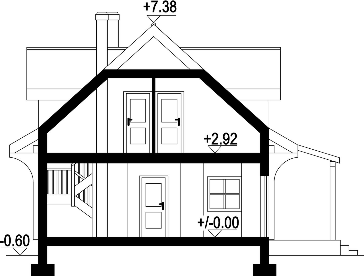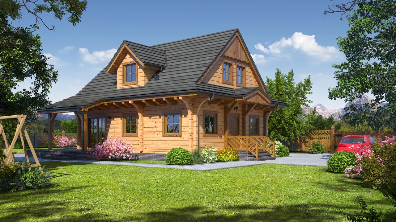 Wysokość ścianki kolankowej: 0.69 m. Ilość drewna na więźbę: 8.77 m³. Strop: drewniany. Pokrycie dachu: dachówka gontopodobna z posypką Gerard Corona. Ściany zewnętrzne: płazy drewniane + wełna mineralna + deska. Ściany wewnętrzne: płazy drewniane. Typ ogrzewania: kocioł gazowy.