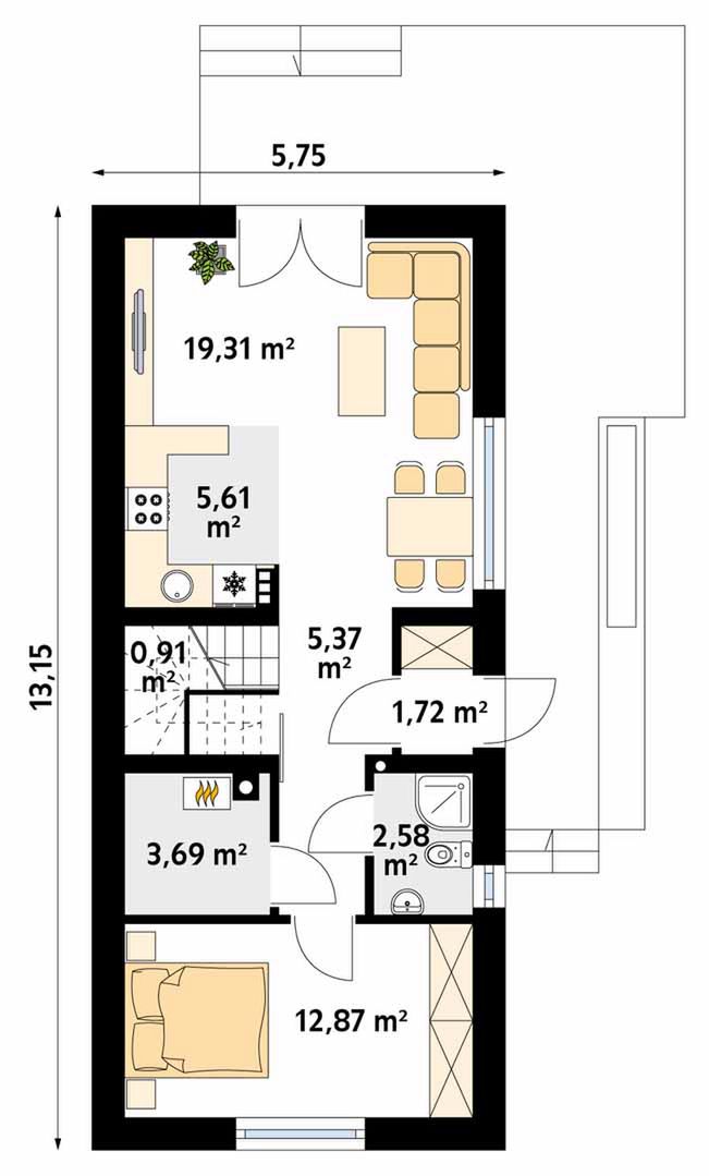 Graficzne opracowanie rzutów poglądowych widocznych na karcie projektu zostało wykonane przez Extradom.pl. Prezentowane przez Extradom.pl wizualizacje wykonane zostały przez autora projektu i należy poczytywać je jedynie za przykład i propozycję wykończenia, wizję architektoniczną autora projektu. Ostateczne wykończenie budynku może nastąpić na wiele sposobów. Szczegółowe rozwiązania zastosowane w oferowanej dokumentacji - w tym również ilość, lokalizacje i wygląd okien, drzwi, kominów - mogą w niewielkim stopniu różnić się od prezentowanej wizualizacji budynku.