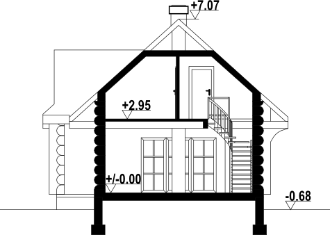 Wysokość ścianki kolankowej: 1.04 m. Strop: drewniany. Pokrycie dachu: dachówka ceramiczna. Ściany zewnętrzne: płazy drewniane + wełna mineralna + deska. Ściany wewnętrzne: szkieletowe drewniane. Typ ogrzewania: kocioł gazowy. Inne: okna połaciowe Velux.