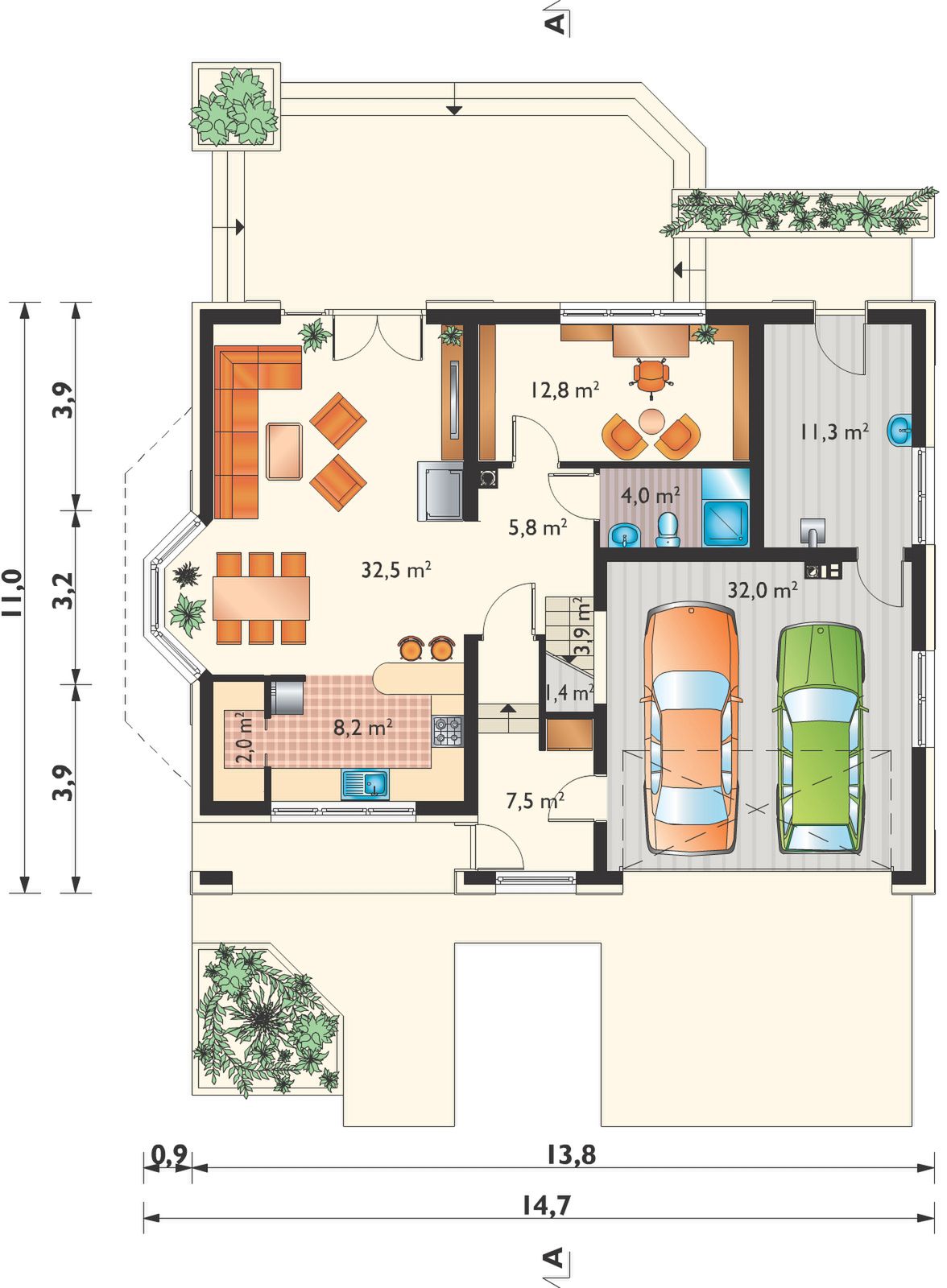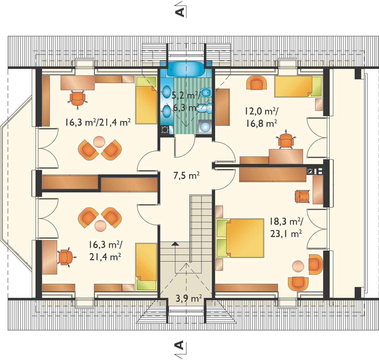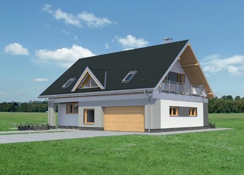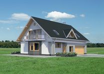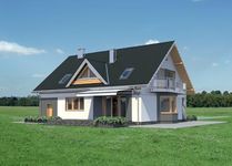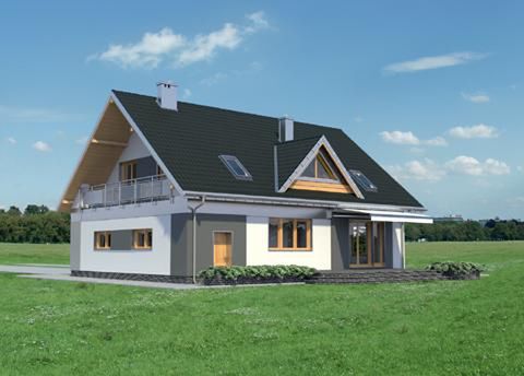 Graficzne opracowanie rzutów poglądowych widocznych na karcie projektu zostało wykonane przez Extradom.pl. Prezentowane przez Extradom.pl wizualizacje wykonane zostały przez autora projektu i należy poczytywać je jedynie za przykład i propozycję wykończenia, wizję architektoniczną autora projektu. Ostateczne wykończenie budynku może nastąpić na wiele sposobów. Szczegółowe rozwiązania zastosowane w oferowanej dokumentacji - w tym również ilość, lokalizacje i wygląd okien, drzwi, kominów - mogą w niewielkim stopniu różnić się od prezentowanej wizualizacji budynku.