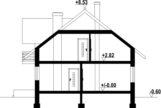 Wysokość ścianki kolankowej: 1.13 m. Strop: płyta żelbetowa. Pokrycie dachu: dachówka ceramiczna. Ściany zewnętrzne: pustaki ceramiczne + styropian. Ściany wewnętrzne: pustaki ceramiczne. Typ ogrzewania: kocioł gazowy lub kocioł na paliwo stałe. Instalacje dodatkowe: instalacja solarna. Inne: okna połaciowe Fakro.