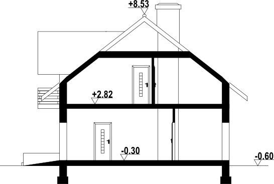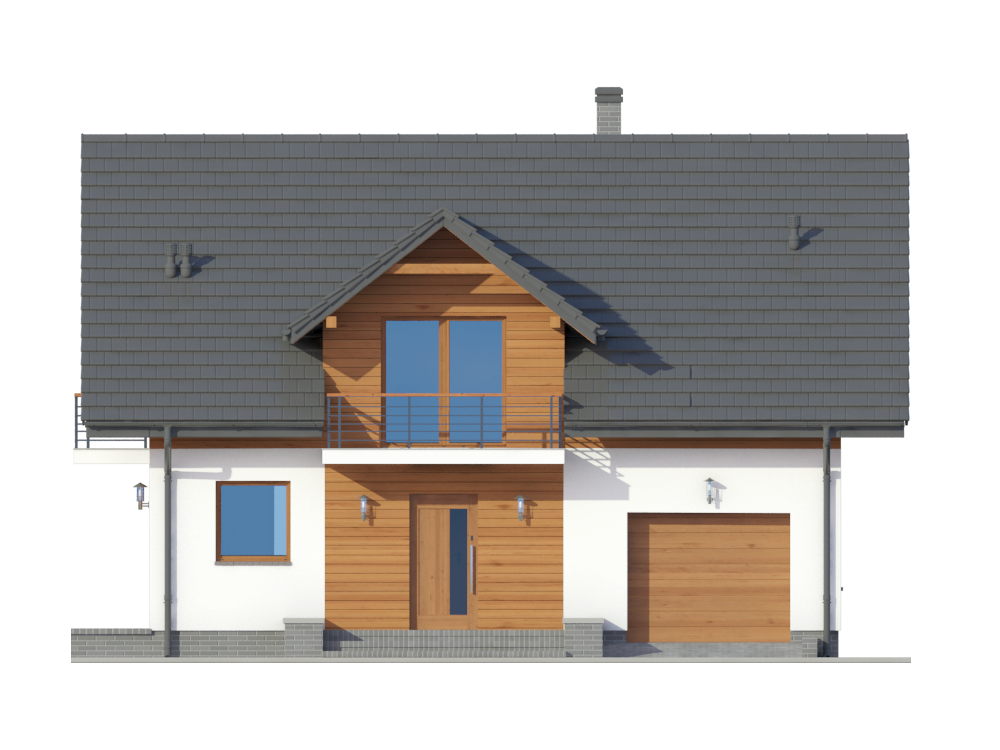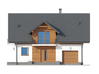 Wysokość ścianki kolankowej: 1.13 m. Strop: płyta żelbetowa. Pokrycie dachu: dachówka ceramiczna Koramic. Ściany zewnętrzne: pustaki ceramiczne Porotherm + styropian. Ściany wewnętrzne: pustaki ceramiczne Porotherm. Typ ogrzewania: kocioł gazowy lub kocioł na paliwo stałe. Inne: okna połaciowe Fakro, brama garażowa Hörmann.