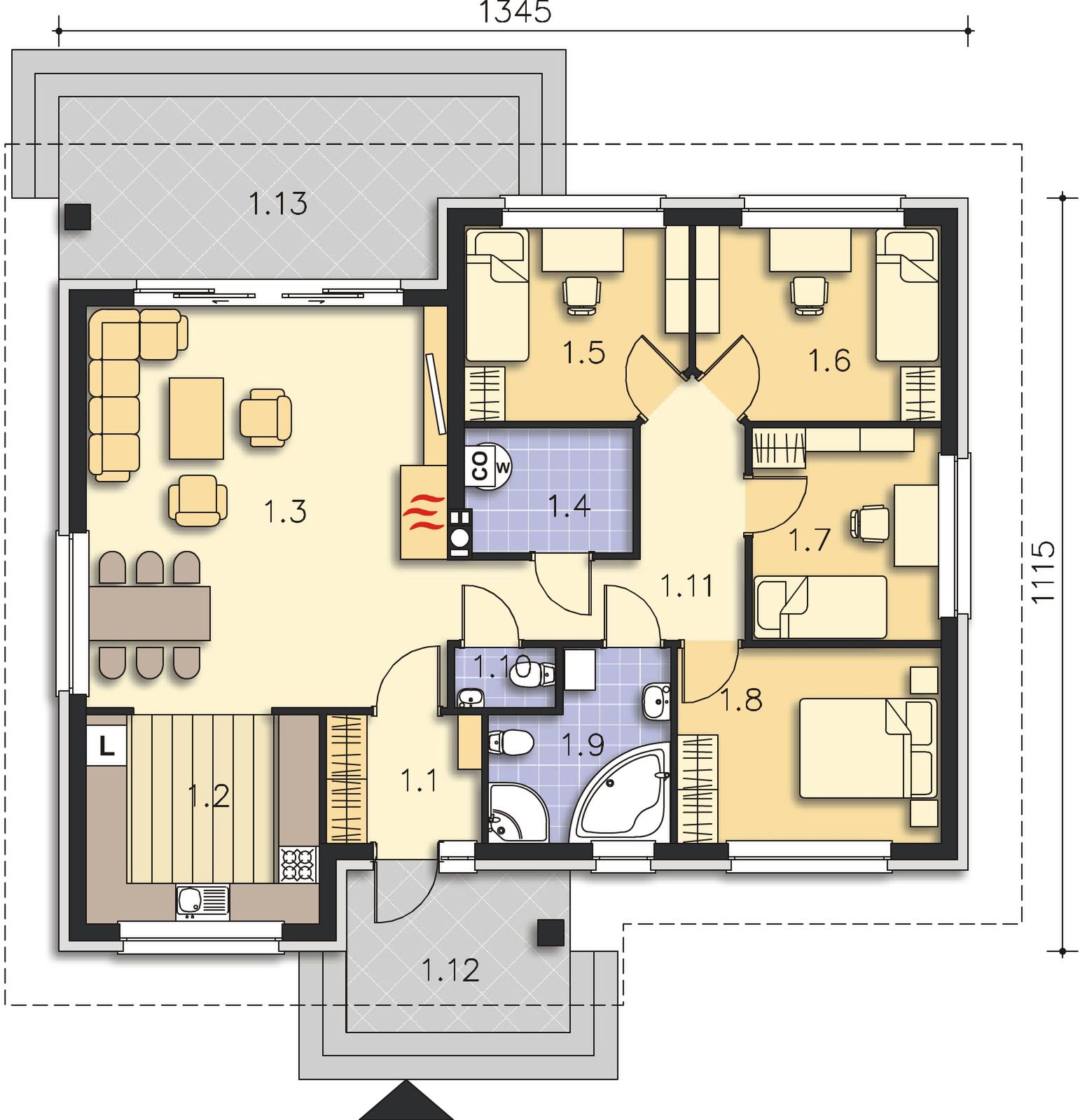 Graficzne opracowanie rzutów poglądowych widocznych na karcie projektu zostało wykonane przez Extradom.pl. Prezentowane przez Extradom.pl wizualizacje wykonane zostały przez autora projektu i należy poczytywać je jedynie za przykład i propozycję wykończenia, wizję architektoniczną autora projektu. Ostateczne wykończenie budynku może nastąpić na wiele sposobów. Szczegółowe rozwiązania zastosowane w oferowanej dokumentacji - w tym również ilość, lokalizacje i wygląd okien, drzwi, kominów - mogą w niewielkim stopniu różnić się od prezentowanej wizualizacji budynku.