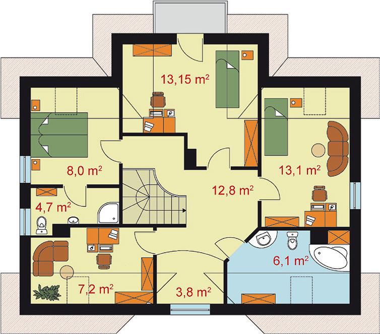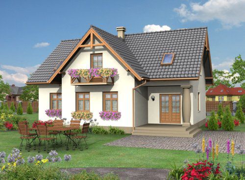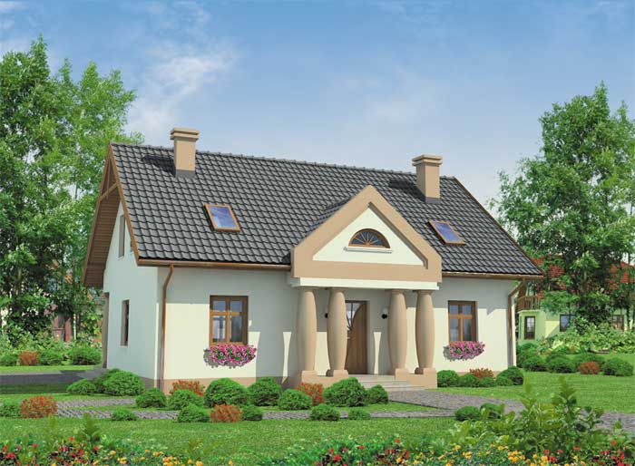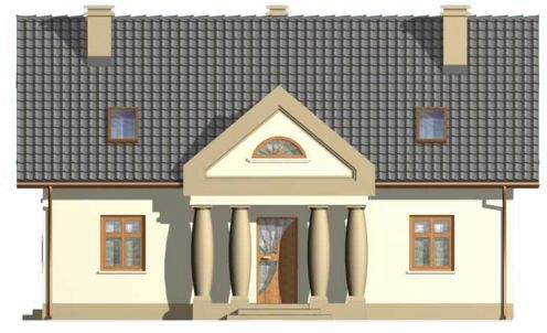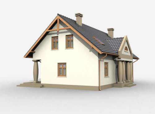 Graficzne opracowanie rzutów poglądowych widocznych na karcie projektu zostało wykonane przez Extradom.pl. Prezentowane przez Extradom.pl wizualizacje wykonane zostały przez autora projektu i należy poczytywać je jedynie za przykład i propozycję wykończenia, wizję architektoniczną autora projektu. Ostateczne wykończenie budynku może nastąpić na wiele sposobów. Szczegółowe rozwiązania zastosowane w oferowanej dokumentacji - w tym również ilość, lokalizacje i wygląd okien, drzwi, kominów - mogą w niewielkim stopniu różnić się od prezentowanej wizualizacji budynku.