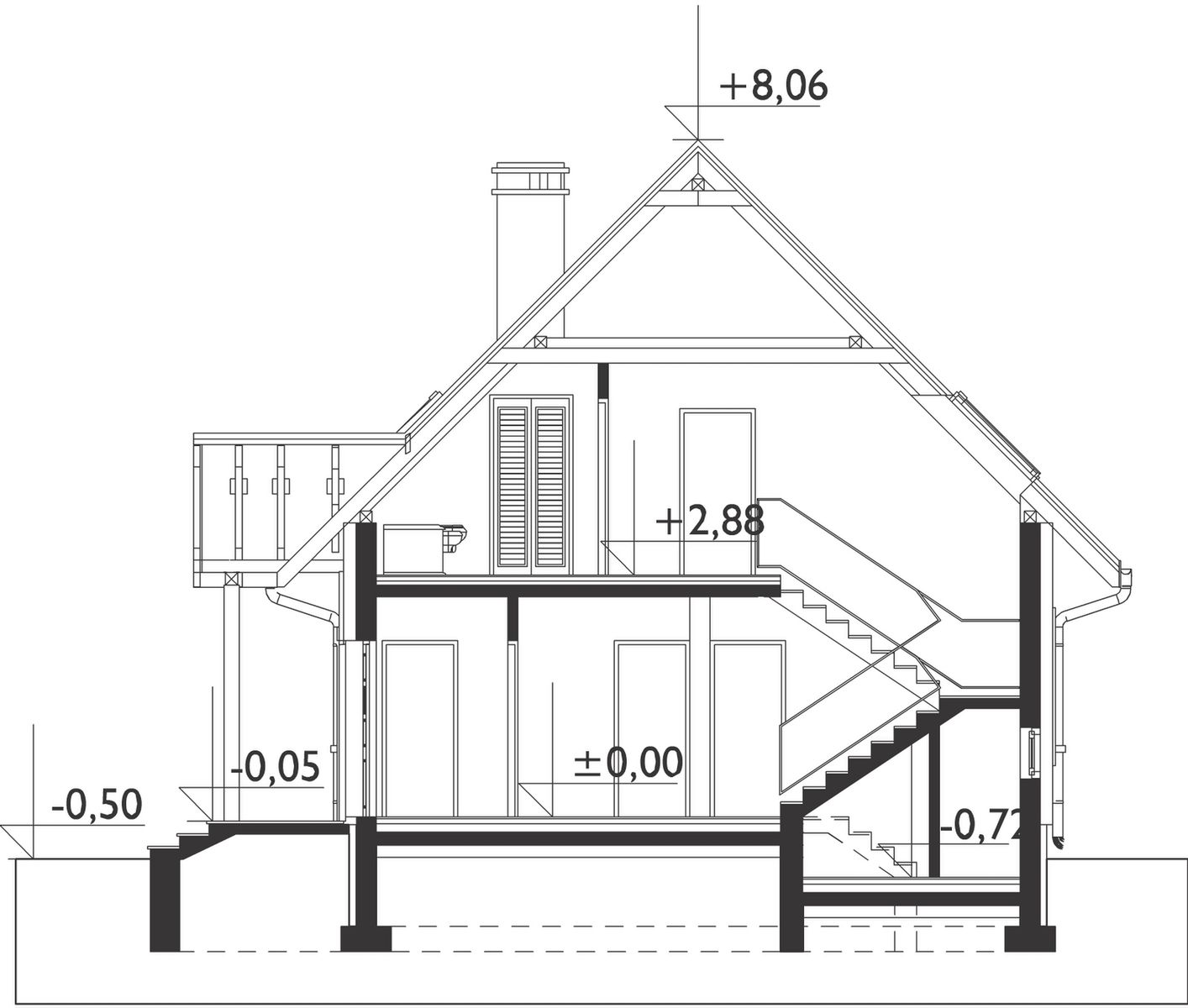 Wersja technologiczna: murowana - beton komórkowy. Izolacja termiczna ścian zewnętrznych: Austrotherm. Strop: żelbetowy monolityczny. Typ schodów: płytowe żelbetowe. Konstrukcja dachu: drewniana krokwiowo-jętkowa. Typ ogrzewania: Kocioł na gaz. Dostępna wersja z paliwem stałym: Tak. Dostępna wersja z pompą ciepła: Tak. Ściany zewnętrzne: 24 cm beton komórkowy. Ściany wewnętrzne: 24 cm beton komórkowy. Ściany wewnętrzne działowe: 12 cm beton komórkowy.