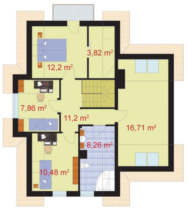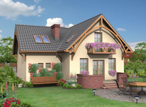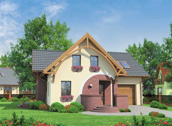 Graficzne opracowanie rzutów poglądowych widocznych na karcie projektu zostało wykonane przez Extradom.pl. Prezentowane przez Extradom.pl wizualizacje wykonane zostały przez autora projektu i należy poczytywać je jedynie za przykład i propozycję wykończenia, wizję architektoniczną autora projektu. Ostateczne wykończenie budynku może nastąpić na wiele sposobów. Szczegółowe rozwiązania zastosowane w oferowanej dokumentacji - w tym również ilość, lokalizacje i wygląd okien, drzwi, kominów - mogą w niewielkim stopniu różnić się od prezentowanej wizualizacji budynku.