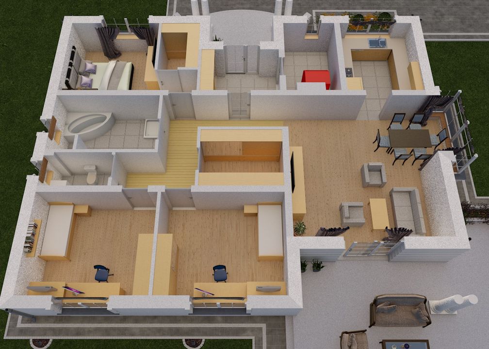 Graficzne opracowanie rzutów poglądowych widocznych na karcie projektu zostało wykonane przez Extradom.pl. Prezentowane przez Extradom.pl wizualizacje wykonane zostały przez autora projektu i należy poczytywać je jedynie za przykład i propozycję wykończenia, wizję architektoniczną autora projektu. Ostateczne wykończenie budynku może nastąpić na wiele sposobów. Szczegółowe rozwiązania zastosowane w oferowanej dokumentacji - w tym również ilość, lokalizacje i wygląd okien, drzwi, kominów - mogą w niewielkim stopniu różnić się od prezentowanej wizualizacji budynku.