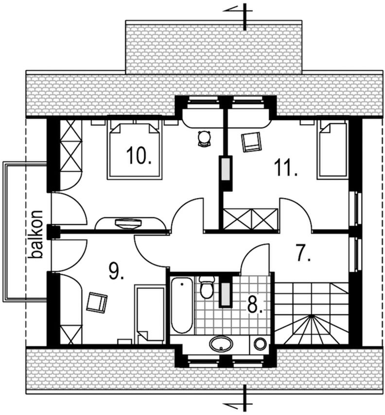 Ściany zewnętrzne dwuwarstwowe: cegła SILKA + wełna mineralna + tynk. Ściany wewnętrzne: cegła SILKA i/lub płyty na ruszcie stalowym, wygłuszone wełną mineralną. Strop: wylewany. Więźba dachowa: tradycyjna drewniana. Poszycie dachu: dachówka cementowa. Stolarka: drewniana lub PCV. Instalacja centralnego ogrzewania: kocioł dwufunkcyjny + grzejniki.