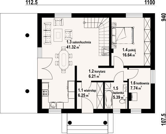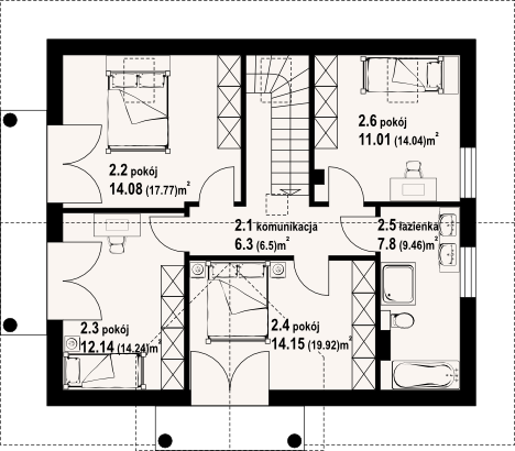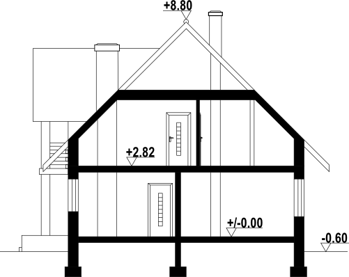 Wysokość ścianki kolankowej: 1.02 m. Strop: płyta żelbetowa. Pokrycie dachu: dachówka ceramiczna. Ściany zewnętrzne: pustaki ceramiczne + styropian. Ściany wewnętrzne: pustaki ceramiczne. Typ ogrzewania: kocioł gazowy lub kocioł na paliwo stałe. Inne: okna połaciowe Fakro.