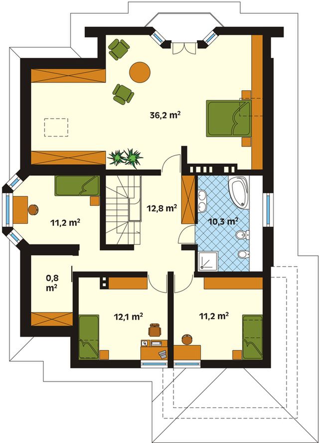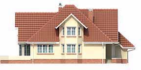 Graficzne opracowanie rzutów poglądowych widocznych na karcie projektu zostało wykonane przez Extradom.pl. Prezentowane przez Extradom.pl wizualizacje wykonane zostały przez autora projektu i należy poczytywać je jedynie za przykład i propozycję wykończenia, wizję architektoniczną autora projektu. Ostateczne wykończenie budynku może nastąpić na wiele sposobów. Szczegółowe rozwiązania zastosowane w oferowanej dokumentacji - w tym również ilość, lokalizacje i wygląd okien, drzwi, kominów - mogą w niewielkim stopniu różnić się od prezentowanej wizualizacji budynku.