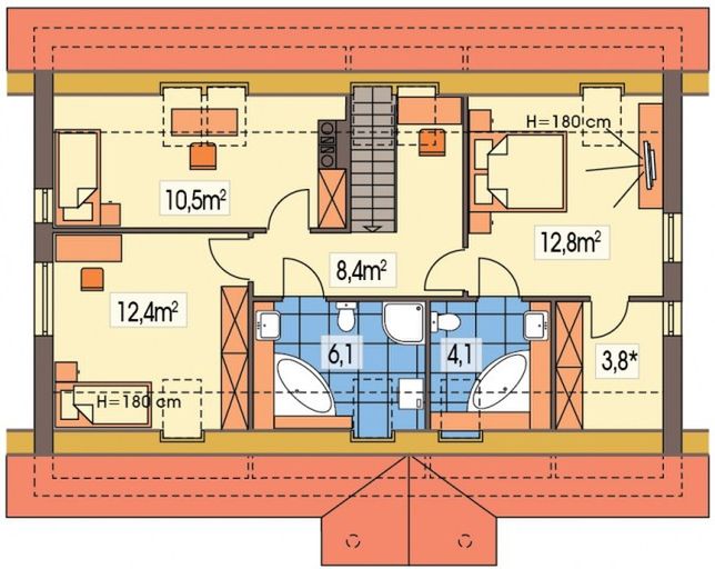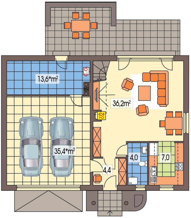 Graficzne opracowanie rzutów poglądowych widocznych na karcie projektu zostało wykonane przez Extradom.pl. Prezentowane przez Extradom.pl wizualizacje wykonane zostały przez autora projektu i należy poczytywać je jedynie za przykład i propozycję wykończenia, wizję architektoniczną autora projektu. Ostateczne wykończenie budynku może nastąpić na wiele sposobów. Szczegółowe rozwiązania zastosowane w oferowanej dokumentacji - w tym również ilość, lokalizacje i wygląd okien, drzwi, kominów - mogą w niewielkim stopniu różnić się od prezentowanej wizualizacji budynku.