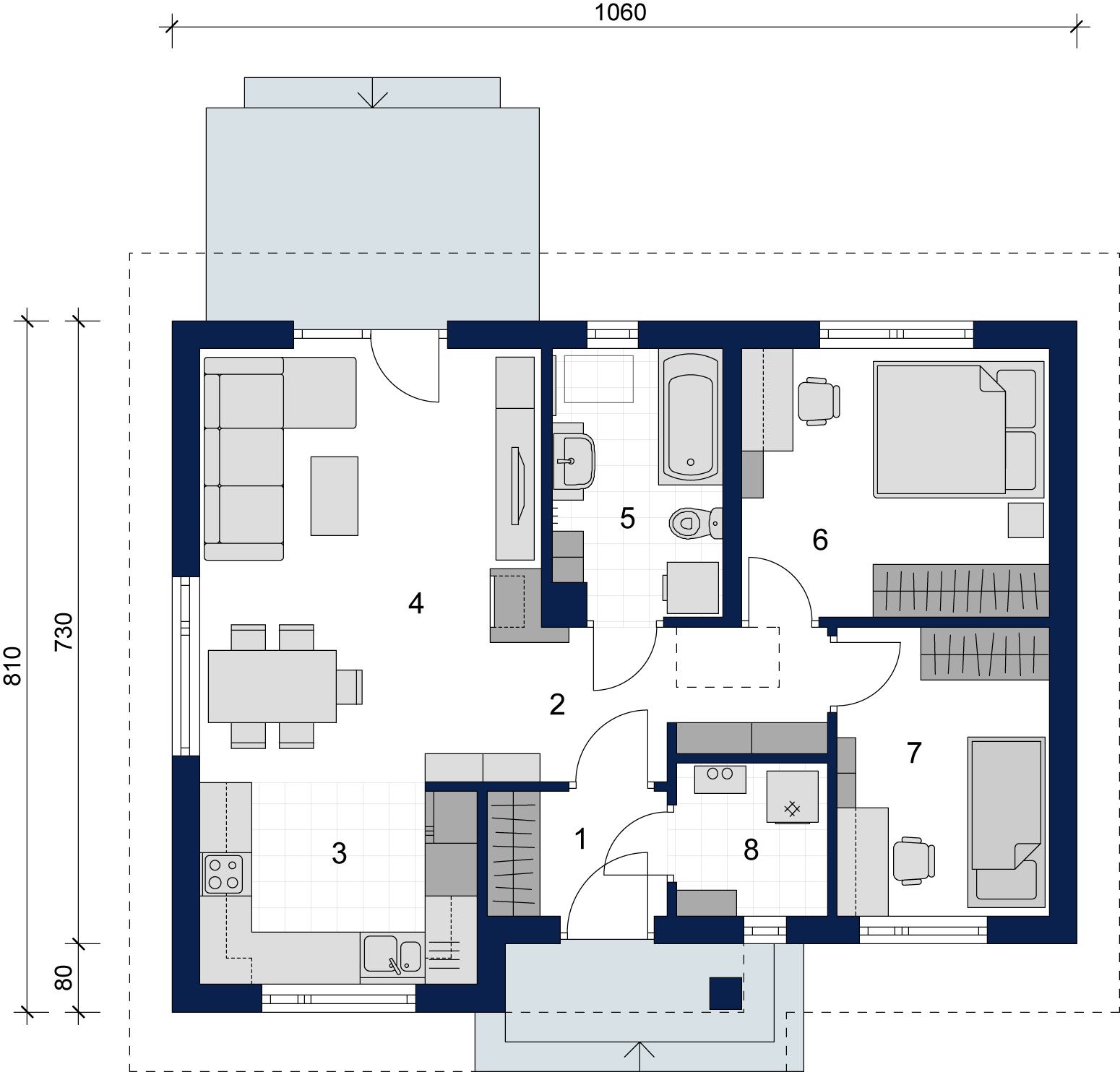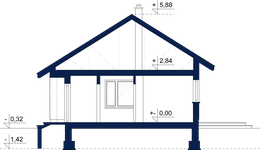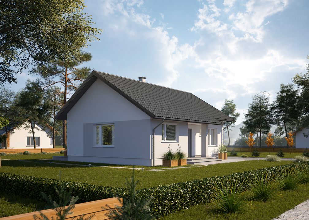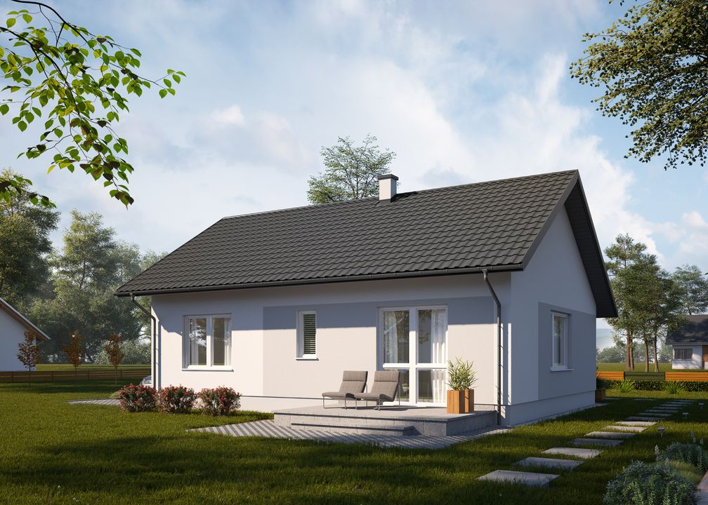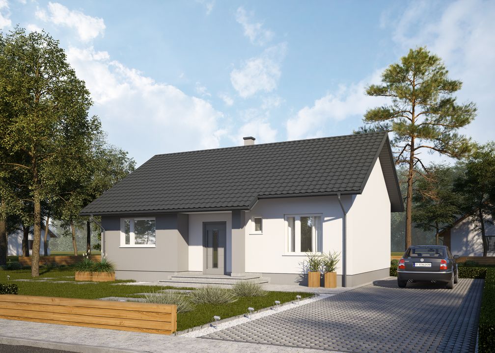 Graficzne opracowanie rzutów poglądowych widocznych na karcie projektu zostało wykonane przez Extradom.pl. Prezentowane przez Extradom.pl wizualizacje wykonane zostały przez autora projektu i należy poczytywać je jedynie za przykład i propozycję wykończenia, wizję architektoniczną autora projektu. Ostateczne wykończenie budynku może nastąpić na wiele sposobów. Szczegółowe rozwiązania zastosowane w oferowanej dokumentacji - w tym również ilość, lokalizacje i wygląd okien, drzwi, kominów - mogą w niewielkim stopniu różnić się od prezentowanej wizualizacji budynku.