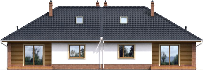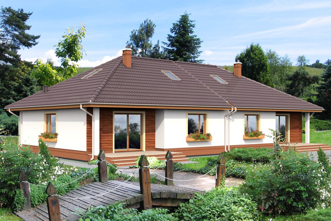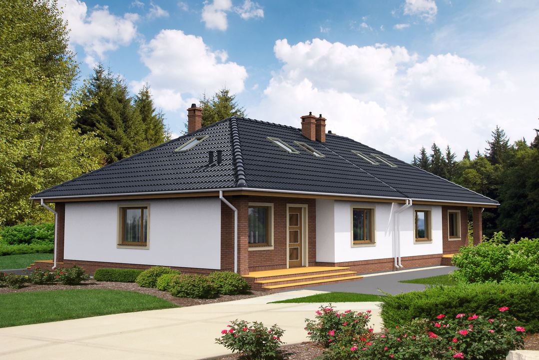 Graficzne opracowanie rzutów poglądowych widocznych na karcie projektu zostało wykonane przez Extradom.pl. Prezentowane przez Extradom.pl wizualizacje wykonane zostały przez autora projektu i należy poczytywać je jedynie za przykład i propozycję wykończenia, wizję architektoniczną autora projektu. Ostateczne wykończenie budynku może nastąpić na wiele sposobów. Szczegółowe rozwiązania zastosowane w oferowanej dokumentacji - w tym również ilość, lokalizacje i wygląd okien, drzwi, kominów - mogą w niewielkim stopniu różnić się od prezentowanej wizualizacji budynku.