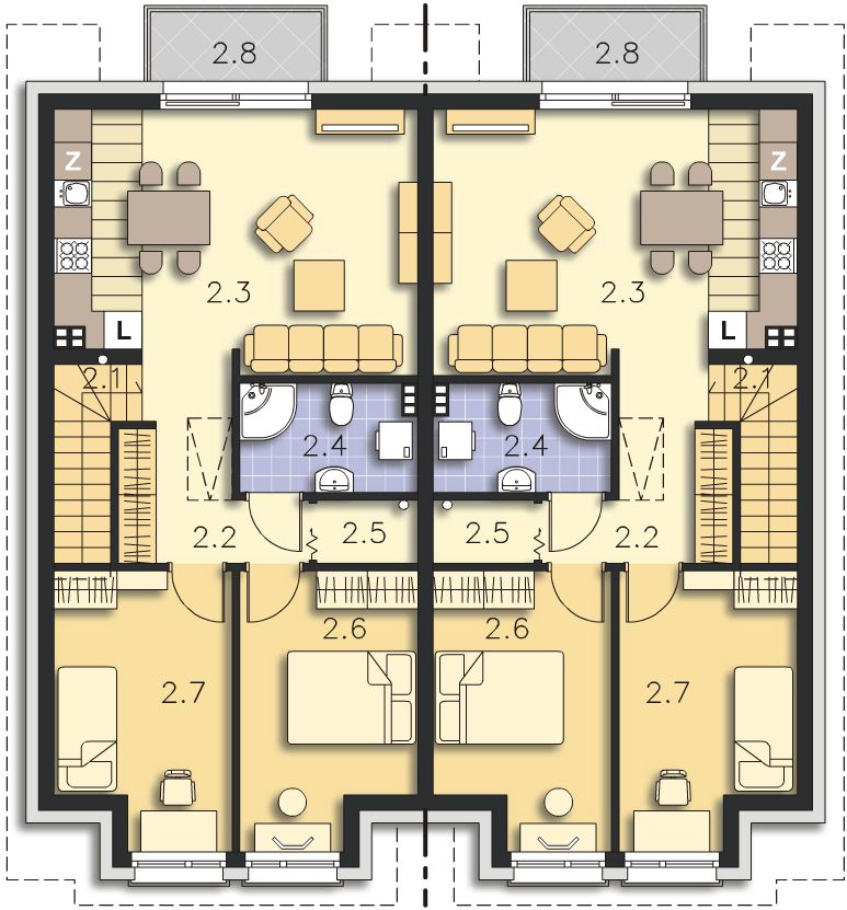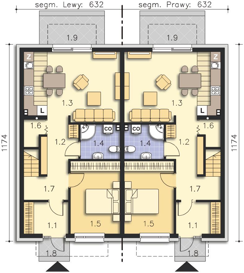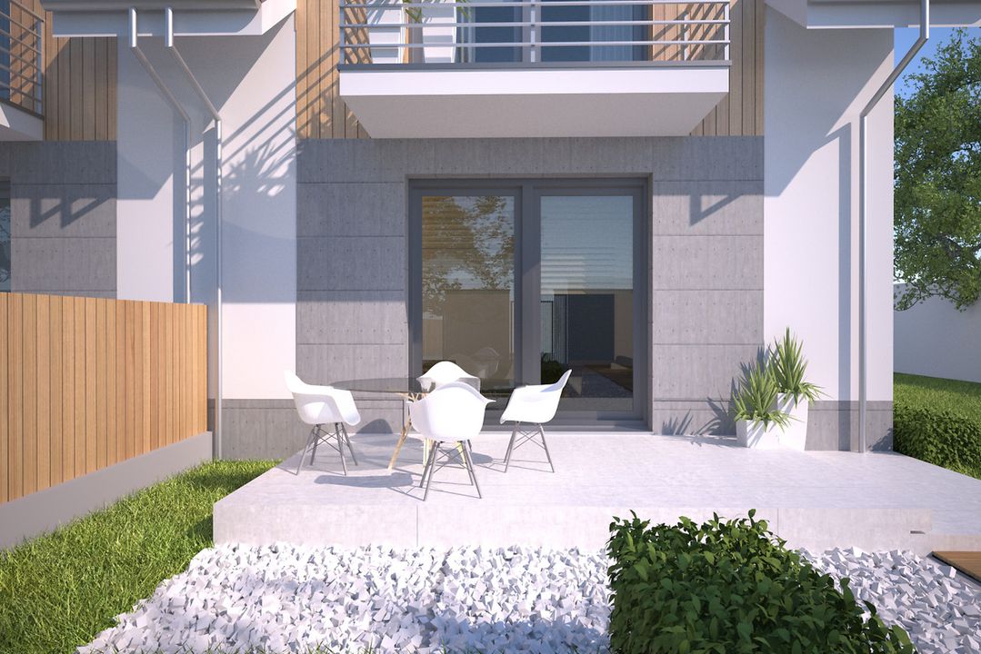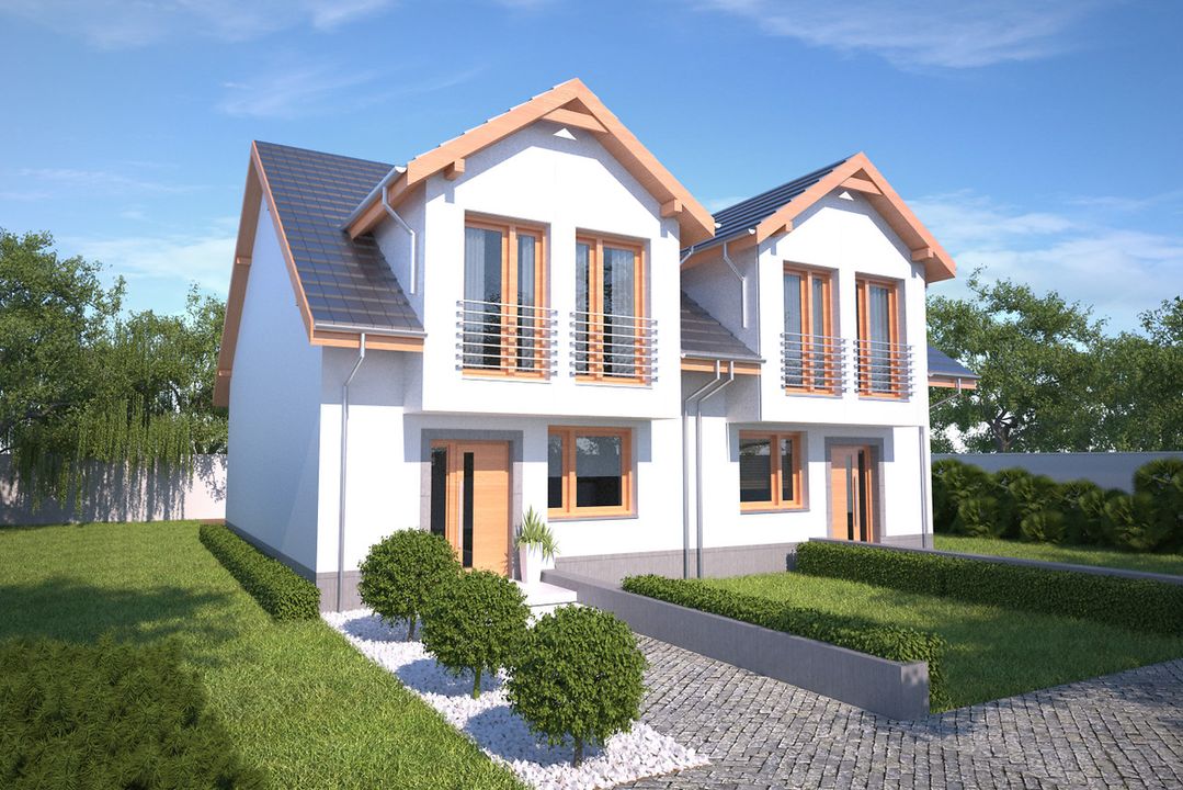 Graficzne opracowanie rzutów poglądowych widocznych na karcie projektu zostało wykonane przez Extradom.pl. Prezentowane przez Extradom.pl wizualizacje wykonane zostały przez autora projektu i należy poczytywać je jedynie za przykład i propozycję wykończenia, wizję architektoniczną autora projektu. Ostateczne wykończenie budynku może nastąpić na wiele sposobów. Szczegółowe rozwiązania zastosowane w oferowanej dokumentacji - w tym również ilość, lokalizacje i wygląd okien, drzwi, kominów - mogą w niewielkim stopniu różnić się od prezentowanej wizualizacji budynku.