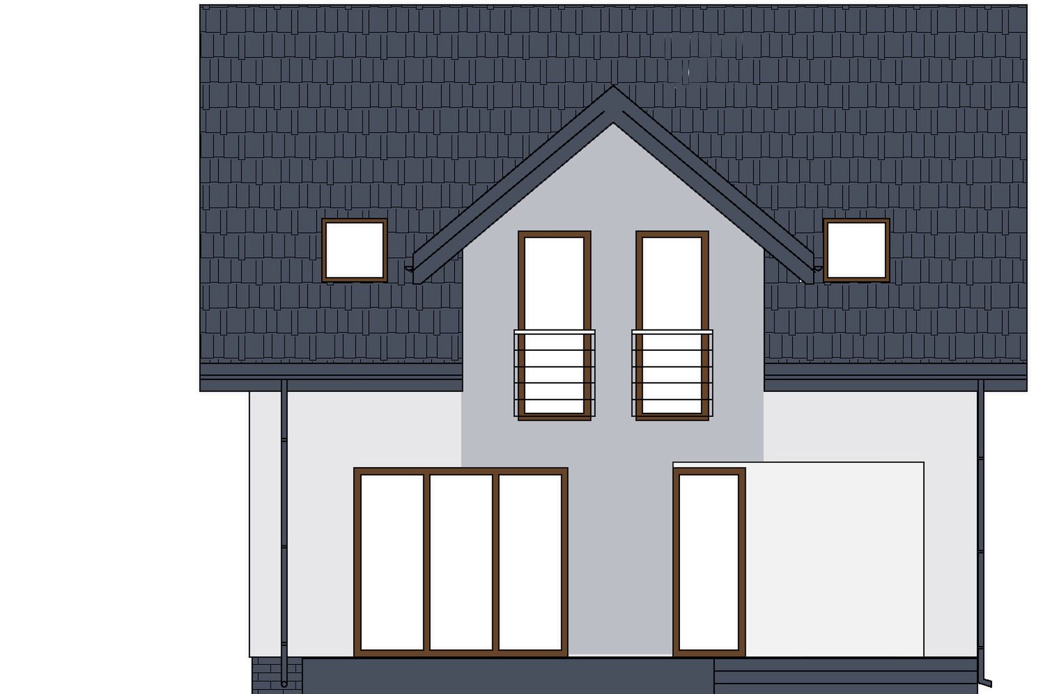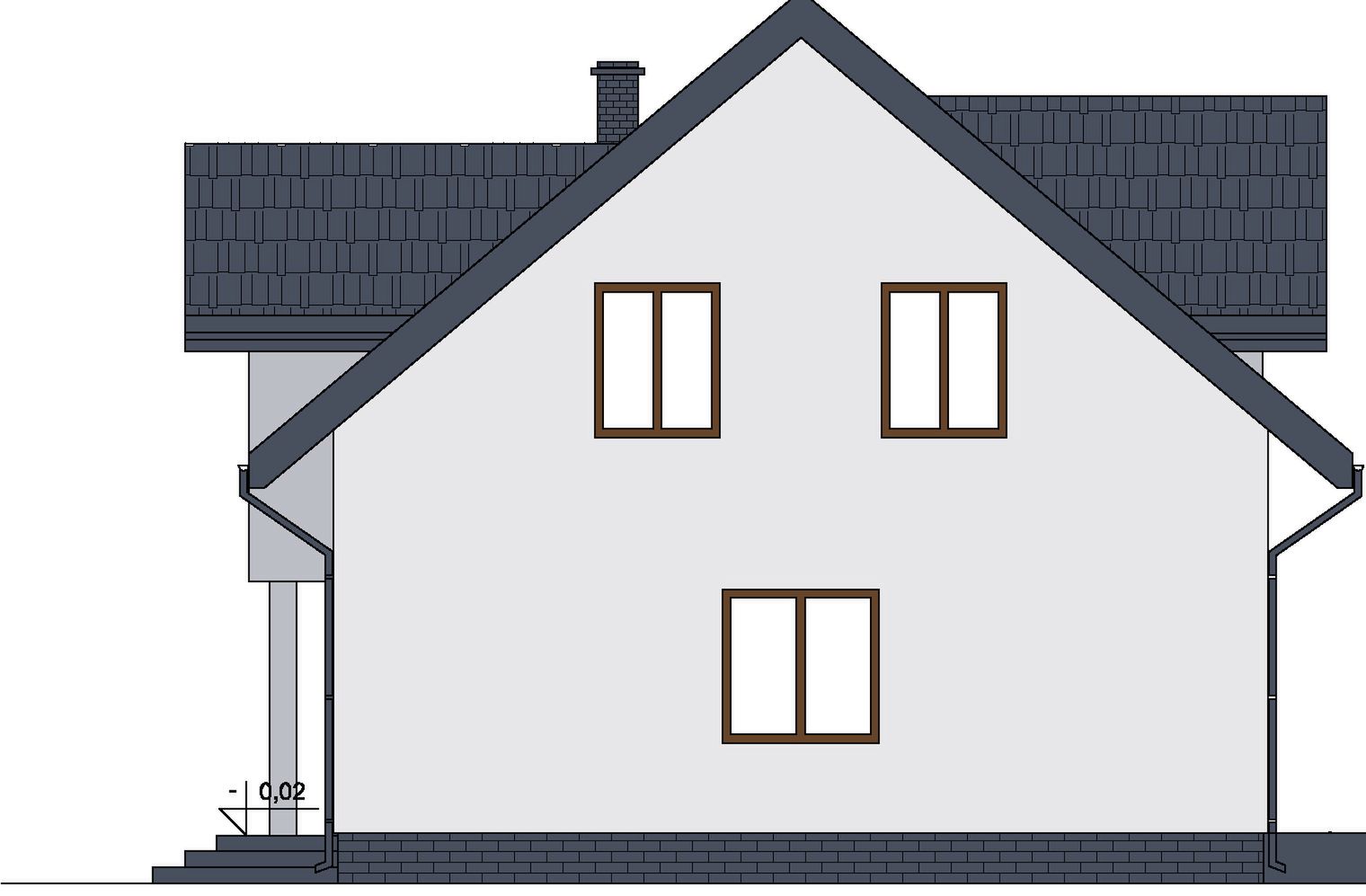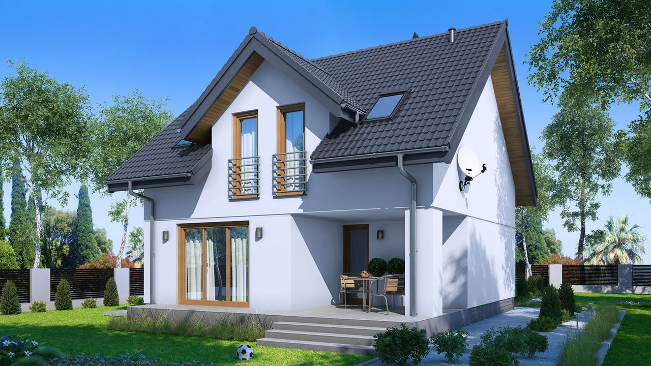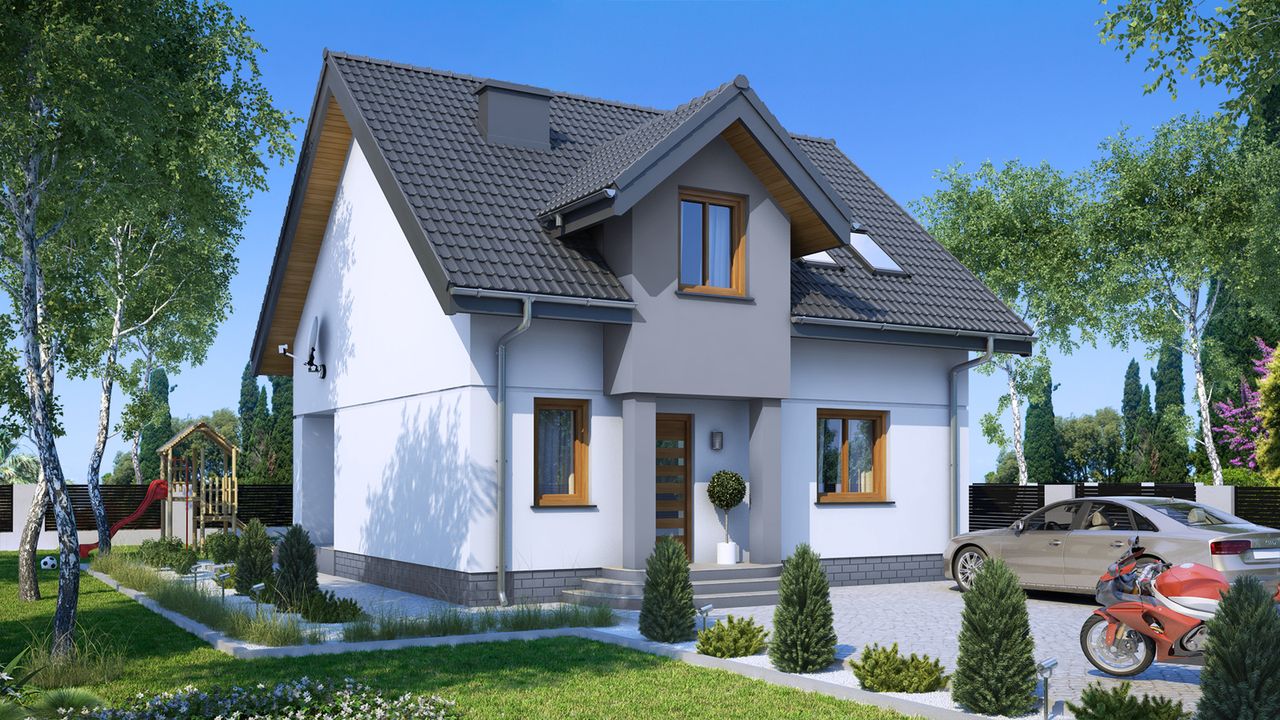 Projekt charakteryzuje się prostą, zwartą bryłą przykrytą klasycznym dachem dwuspadowym, co jest rozwiązaniem sprawdzonym, estetycznym i ekonomicznym w budowie. Tradycyjny styl domu podkreślają klasyczne proporcje i dach z okapem. Uroku dodaje praktyczny podcień przy wejściu, który nie tylko zdobi elewację, ale także chroni przed deszczem i słońcem.