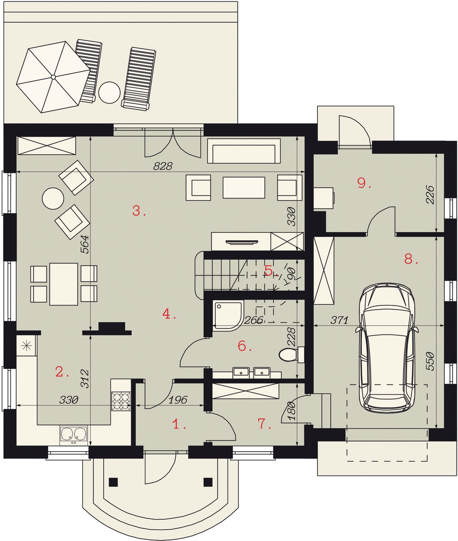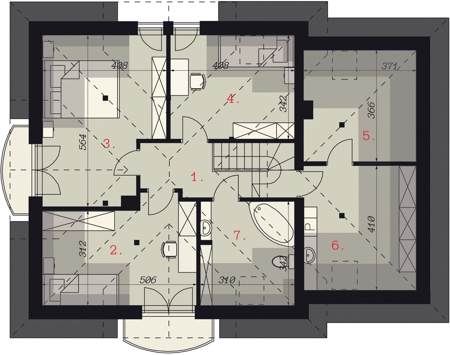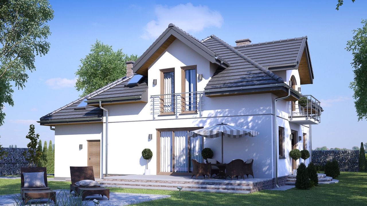 Graficzne opracowanie rzutów poglądowych widocznych na karcie projektu zostało wykonane przez Extradom.pl. Prezentowane przez Extradom.pl wizualizacje wykonane zostały przez autora projektu i należy poczytywać je jedynie za przykład i propozycję wykończenia, wizję architektoniczną autora projektu. Ostateczne wykończenie budynku może nastąpić na wiele sposobów. Szczegółowe rozwiązania zastosowane w oferowanej dokumentacji - w tym również ilość, lokalizacje i wygląd okien, drzwi, kominów - mogą w niewielkim stopniu różnić się od prezentowanej wizualizacji budynku.